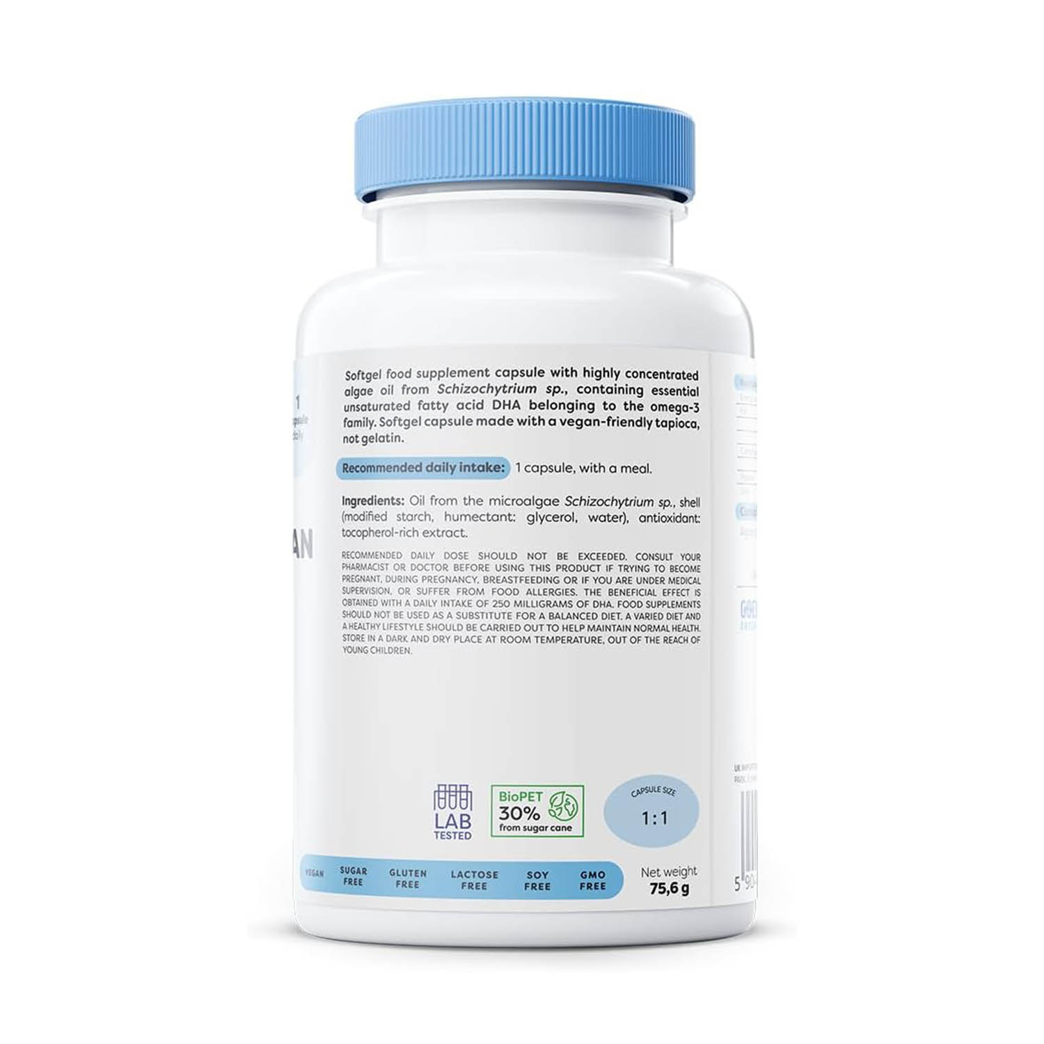 Omega-3 VEGAN, 250 mg DHA, de la Osavi este un supliment alimentar pe bază de ulei de alge, creat pentru a furniza o sursă curată și sustenabilă de acizi grași omega-3, în special acid docosahexaenoic (DHA). Acest produs este perfect pentru persoanele care caută o alternativă vegană la suplimentele tradiționale pe bază de pește, oferind toate beneficiile acizilor grași omega-3 fără a compromite etica vegană sau sustenabilitatea mediului.
