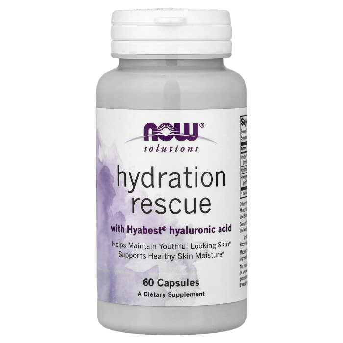 Hydration Rescue with Hyabest® Hyaluronic Acid, NOW Foods este un supliment alimentar premium formulat pentru a susține hidratarea profundă a organismului, elasticitatea pielii, confortul articular și integritatea țesuturilor conjunctive. Formula combină 120 mg de acid hialuronic Hyabest® din hialuronat de sodiu cu 200 mg de colagen hidrolizat din piele de pește, două ingrediente esențiale pentru menținerea structurii, hidratării și rezistenței țesuturilor care susțin frumusețea și mobilitatea organismului.