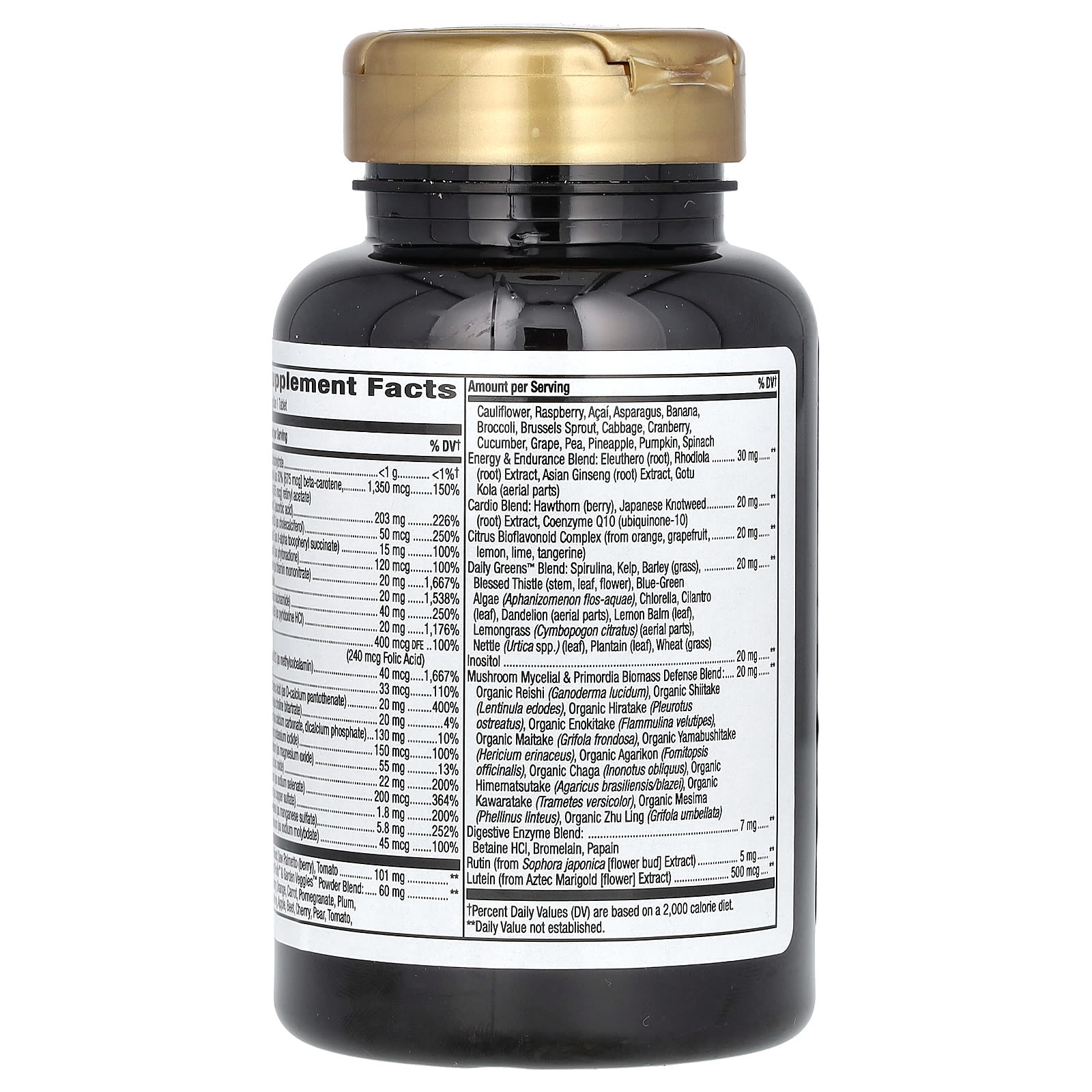 Formula include Orchard Fruits™ & Garden Veggies™ (60 mg) – un concentrat dintr-o paletă largă de fructe și legume: afine, rodie, morcov, prune, căpșuni, sfeclă, zmeură, açaí, broccoli, spanac, struguri și multe altele. Scopul este aportul de polifenoli și pigmenți naturali (carotenoizi, antociani) care completează vitaminele clasice. Daily Greens™ (20 mg) adaugă spirulină, chlorella, kelp, ierburi verzi și plante (păpădie, melisă, coriandru, urzică), contribuind la diversificarea fitonutrienților.