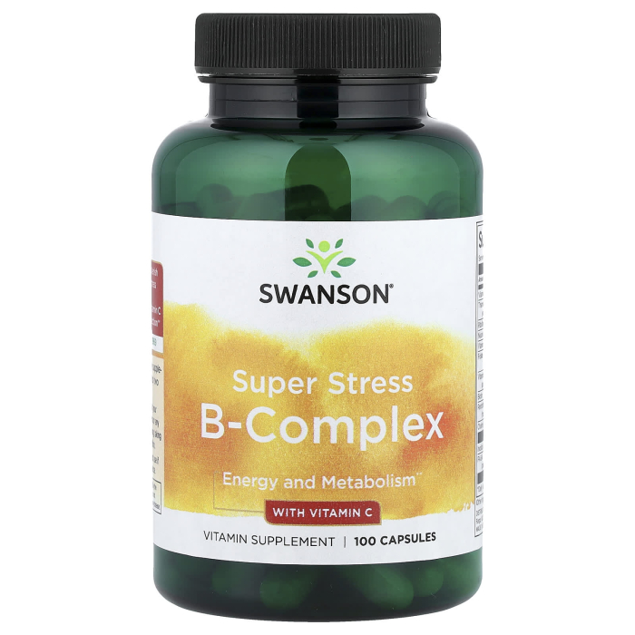 Super Stress B-Complex with Vitamin C, Swanson este un complex avansat de vitamine din grupa B îmbogățit cu o doză concentrată de Vitamina C (500 mg – 556% VNR), conceput pentru perioadele cu program intens, cerințe cognitive ridicate și nevoi crescute de regenerare metabolică. Fiecare porție furnizează cofactori esențiali pentru producția de energie, neurotransmițători și procesele de refacere celulară: Tiamină (B1) 25 mg – 2.083% VNR, Riboflavină (B2) 25 mg – 1.923% VNR, Niacină (B3 ca niacinamidă) 50 mg NE – 313% VNR, Vitamina B6 (piridoxină HCl) 25 mg – 1.471% VNR, Folat 340 mcg DFE (200 mcg acid folic) – 85% VNR, Vitamina B12 (cianocobalamină) 125 µg – 5.208% VNR, Biotină 50 mcg – 167% VNR, Acid pantotenic (B5) 125 mg – 2.500% VNR, plus nutrienți complementari pentru echilibrul nervos și metabolic: Colină 20 mg – 4% VNR, Inozitol 50 mg () și PABA 25 mg (). Această arhitectură nutrițională sinergică oferă suport pentru energie stabilă, stres gestionat eficient, claritate mentală, imunitate și vitalitate cutanată.