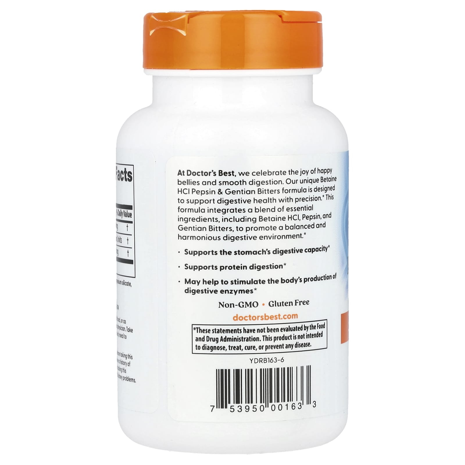Betaine HCl Pepsin & Gentian Bitters, Doctor’s Best, aduce împreună aciditatea corectă, enzima potrivită și amarul care „aprinde” digestia, pentru descompunerea eficientă a proteinelor, confort gastric și absorbția optimă a nutrienților. O soluție modernă pentru un tract digestiv care lucrează cu tine, nu împotriva ta – de la prima înghițitură până la ultimul pas al procesului digestiv.
