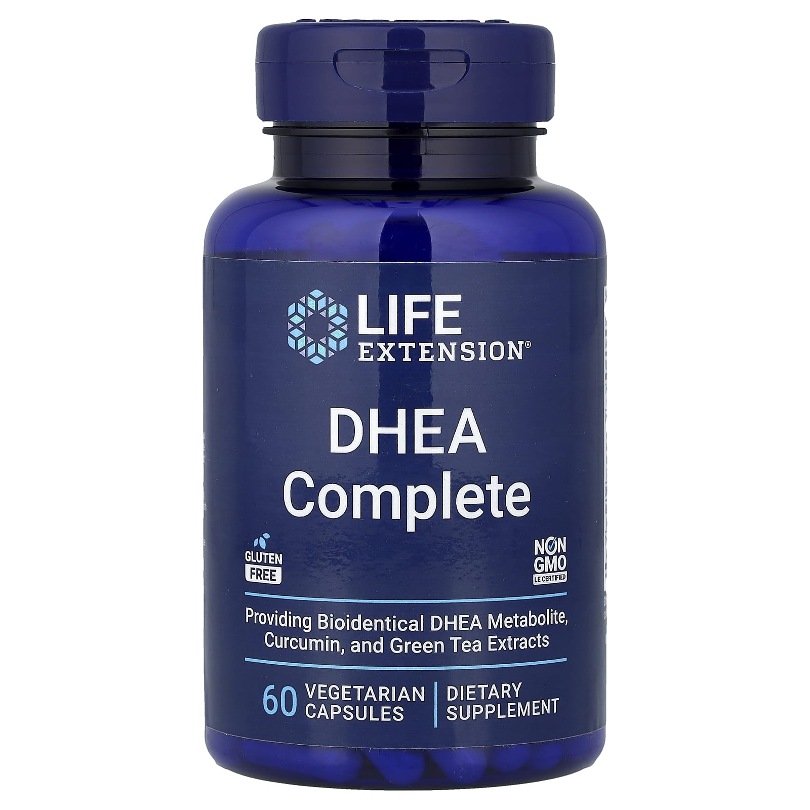 DHEA Complete 7-Keto, Life Extension este un supliment alimentar complex, formulat pentru a susține echilibrul hormonal, metabolismul energetic și procesele biologice asociate îmbătrânirii sănătoase. Formula combină DHEA (dehidroepiandrosteron) 25 mg cu 7-Keto® DHEA 100 mg, alături de vitamina C sub formă de palmitat de ascorbil, extract decofeinizat de ceai verde standardizat la 98% polifenoli, trans-resveratrol și un amestec brevetat CGM Curcumin Elite™, care furnizează curcuminoide, turmeroni și galactomanani din schinduf.