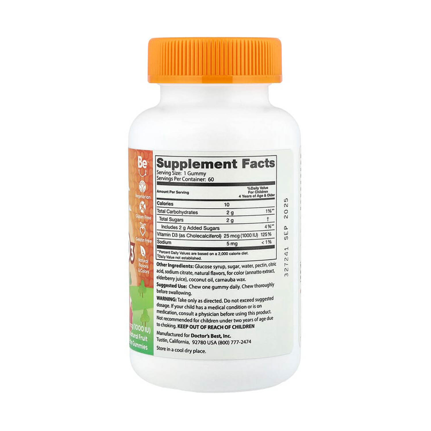 Vitamin D3 Kids Gummies, 1000 IU, Doctor’s Best brings the sunshine vitamin in a kid-approved format: tasty gummies that are easy to fold into the daily routine. Each serving provides 25 mcg (1,000 IU) vitamin D3 (cholecalciferol) — equal to 125% of the Daily Value — with just 10 calories, 2 g carbohydrates (1% DV), and 1 g sugars (1 g added sugars — 2% DV). D3 is the body’s preferred bioactive form, known for its central role in calcium absorption, bone and teeth development, muscle function, immunity, and supporting body–brain rhythm during periods of limited sun exposure.