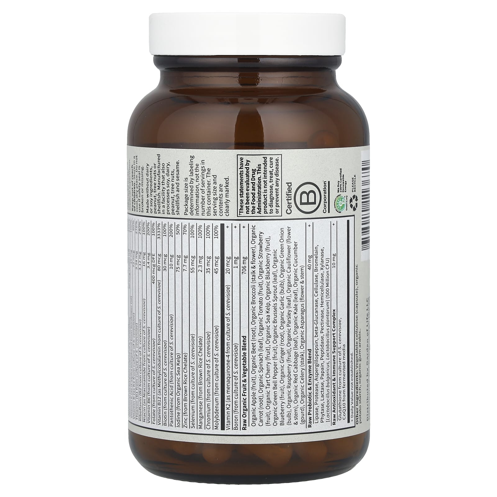| Raw Organic Fruit & Vegetable Blend Organic apple (fruit), Organic beet (root), Organic broccoli (stalk & floret), Organic carrot (root), Organic spinach (leaf), Organic tomato (fruit), Organic strawberry (fruit), Organic tart cherry (fruit), Organic sea vegetables, Organic blackberry (fruit), Organic green bell pepper (fruit), Organic Brussels sprout (leaf), Organic blueberry (fruit), Organic ginger (root), Organic garlic (bulb), Organic green onion (bulb), Organic raspberry (fruit), Organic parsley (leaf), Organic cauliflower (floret & stalk), Organic red cabbage (leaf), Organic kale (leaf), Organic cucumber (gourd), Organic celery (stalk), Organic asparagus (floret & stalk) |