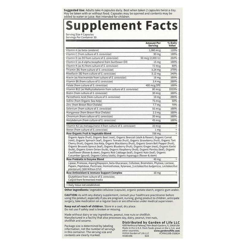 Whole Food Multivitamin For 50 & Wiser Women, Garden of Life is a premium formula, made from “whole food” and nutritional cultures, designed for the specific needs of women over 50. Each serving provides a complete profile of vitamins and minerals in functional doses and body-friendly forms: Vitamin A (beta-carotene) 1,080 mcg (120%), Vitamin C 90 mg (100%), Vitamin D3 50 mcg/2,000 IU (250%), Vitamin E 15 mg (100%), Vitamin K1 72 mcg (60%) + K2 (MK-4) 20 mcg, B-complex (B1 3.24 mg – 270%, B2 3.12 mg – 240%, Niacin 16 mg – 100%, B6 3.4 mg – 200%, Folate 400 µg DFE – 100%, Methylcobalamin B12 80 mcg – 3,333%, Biotin 30 µg – 100%, Pantothenic acid 10 mg – 200%), and essential minerals (Iodine 75 µg – 50%, Zinc 7.7 mg – 70%, Selenium 55 µg – 100%, Manganese 2.3 mg – 100%, Chromium 35 µg – 100%, Molybdenum 45 µg – 100%, Boron 1 mg). The formula is completed by a Raw Organic Fruit & Vegetable Blend (706 mg), a Raw Probiotic & Enzyme Blend (40 mg; 500 million CFU L. bulgaricus & L. plantarum), plus an Antioxidant & Immune Complex (Glutathione and CoQ10).