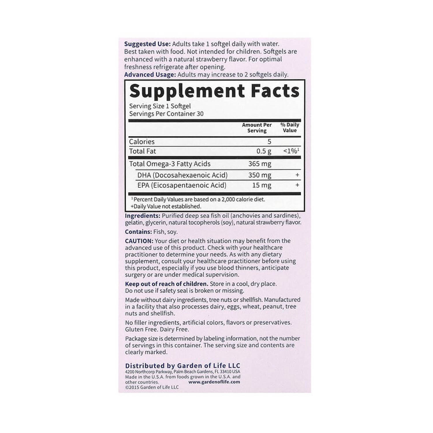 Purified deep ocean fish oil (anchovy and sardine), gelatin, glycerin, natural tocopherols (soy), natural strawberry flavor.