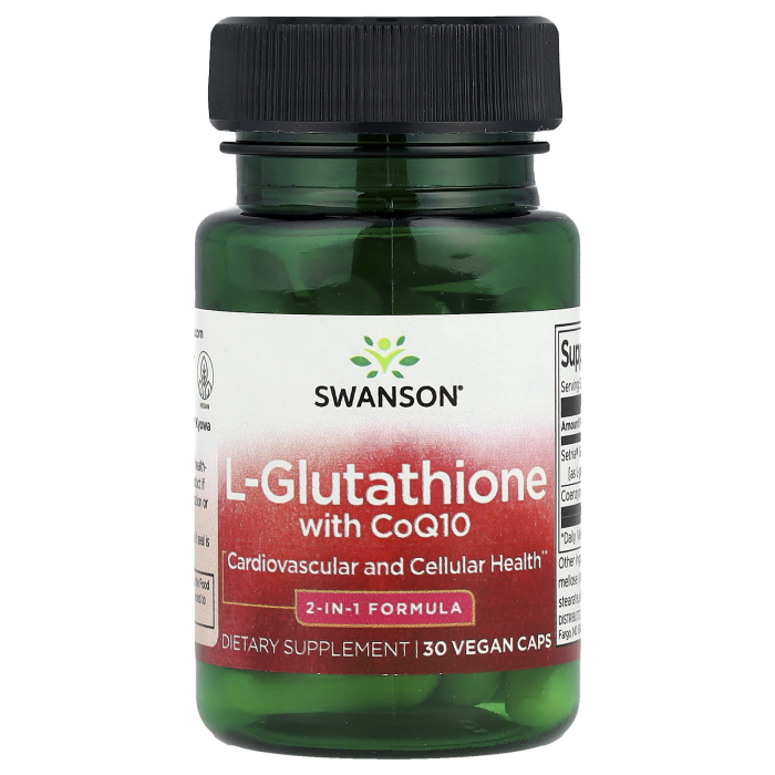 L-Glutathione 200 mg with CoQ10 100 mg, Swanson is a complex dietary supplement, formulated to support two of the body's most important protective systems: antioxidant defense and efficient energy production at the cellular level. The formula combines Setria® L-Glutathione (reduced) – 200 mg, a premium and stable form of glutathione, with Coenzyme Q10 – 100 mg, an essential compound for mitochondrial function and maintaining cardiovascular health.