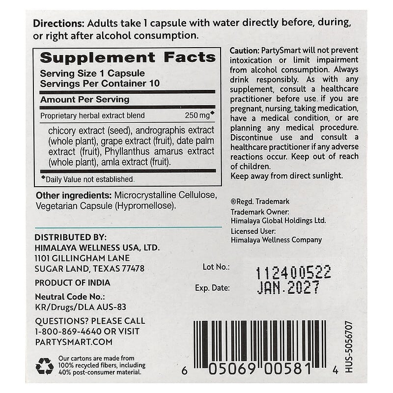 Party Smart (Alcohol Detox), Himalaya is a dietary supplement based on a patented blend of plant extracts, formulated to support the body during periods when the liver and natural neutralization systems are more stressed, especially after occasions where alcohol is consumed. The formula contains 250 mg of standardized extracts from: chicory (seeds), andrographis (whole parts), grapes (fruit), date palm (fruit), phyllanthus (whole plant) and amla (fruit). This combination leverages the principles of Ayurvedic tradition, oriented towards supporting internal balance, digestion and liver function, alongside a complex supply of polyphenols, bitter compounds, antioxidants and phytonutrients.