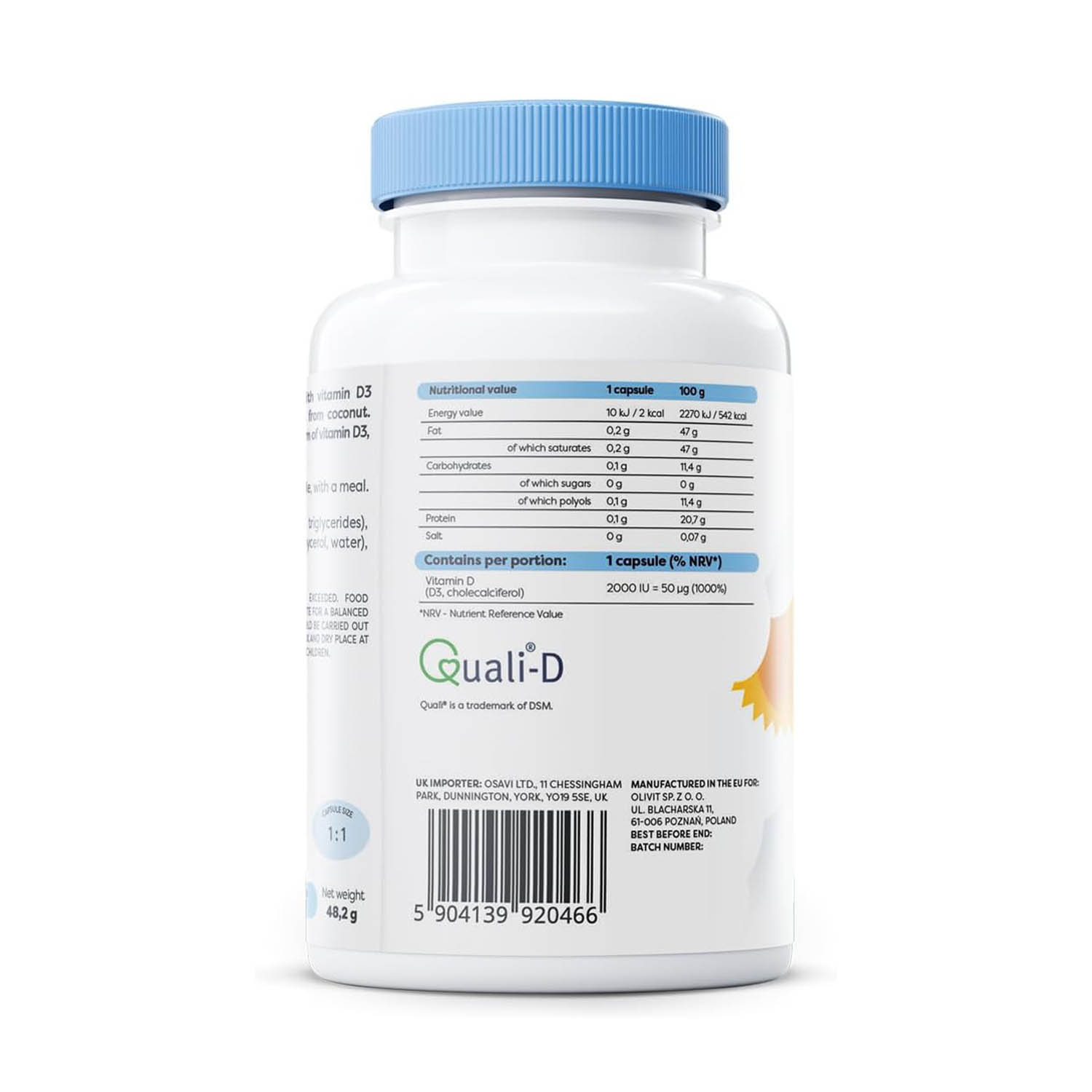 Vitamin D3, 2000 IU, Osavi is a dietary supplement that provides vitamin D3 (cholecalciferol) in an optimal dose of 2000 IU (equivalent to 50 μg). Vitamin D3 is a natural form of vitamin D, synthesized in the skin under the action of UVB sunlight and is essential for maintaining overall health. Especially during winter months or periods of reduced sun exposure, supplementing with vitamin D3 becomes crucial for supporting the normal function of the immune system, bone health, muscle function, and many other physiological processes.