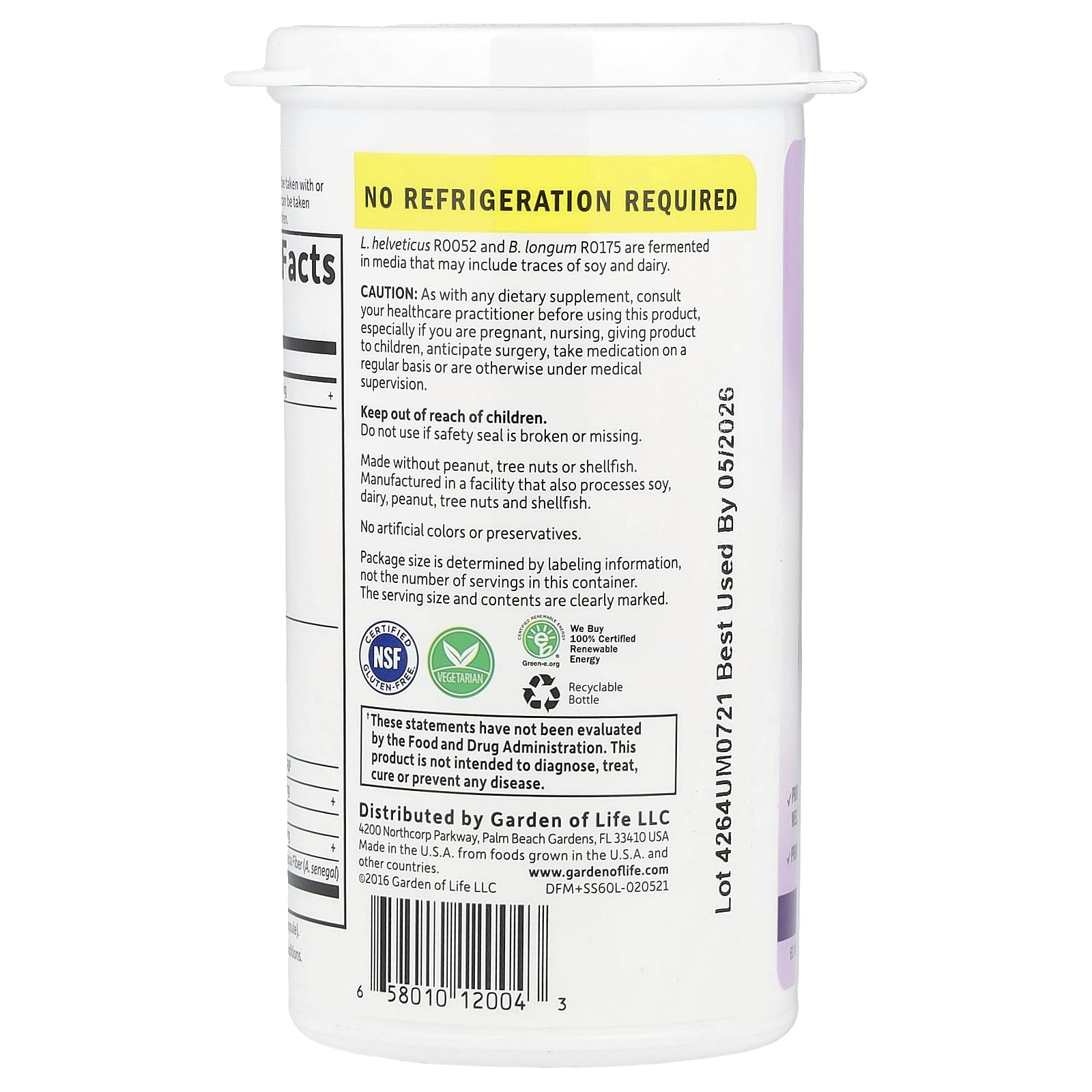 L. helveticus R0052 and B. longum R0175 are fermented in media that may include traces of soy and dairy.