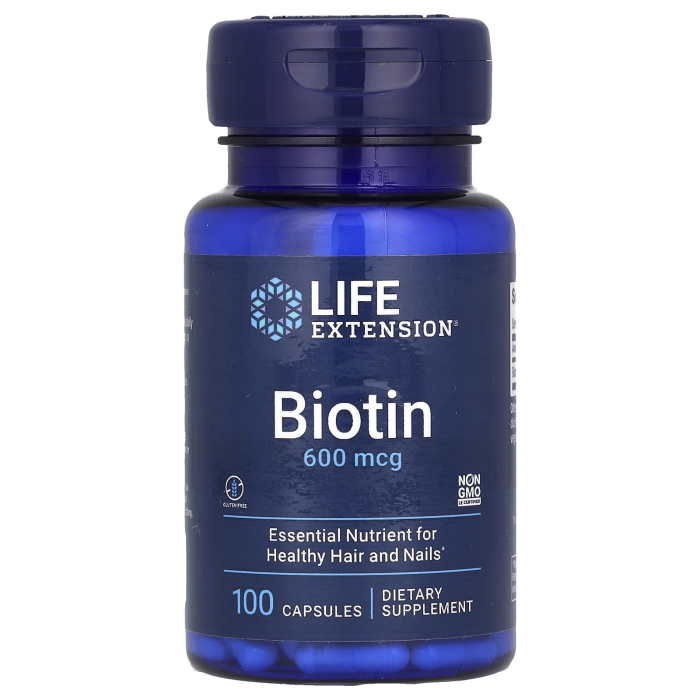 Biotin 600 mcg, Life Extension offers a significant dose (2000% DV), useful for people seeking more intense support for cutaneous appendages (hair, nails) and metabolism. Being a water-soluble vitamin, biotin is naturally integrated into daily metabolic flows and supports processes that constantly run in the background: energy production, tissue regeneration, structural synthesis.