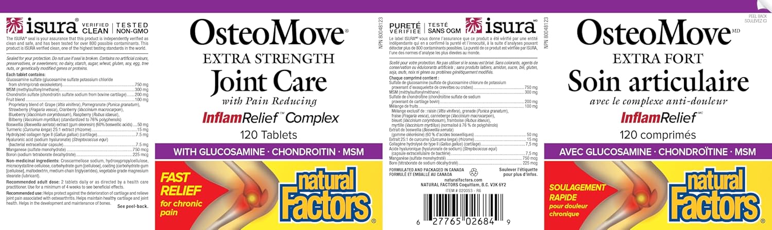 OsteoMove Extra Strength Joint Care, Natural Factors is a premium supplement created specifically for maintaining joint health, supporting mobility and combating joint inflammation. This advanced formula combines proven ingredients such as glucosamine sulfate, chondroitin sulfate, MSM (OptiMSM®), hydrolyzed type II collagen and hyaluronic acid, with concentrated anti-inflammatory plant extracts (Boswellia, turmeric) and a polyphenolic complex rich in antioxidants from fruits (OsteoMove® Ultra Fruit Polyphenol Complex). Together, these components act synergistically to support cartilage structure, joint lubrication, connective tissue regeneration and reduction of pain and chronic inflammation at joint level.