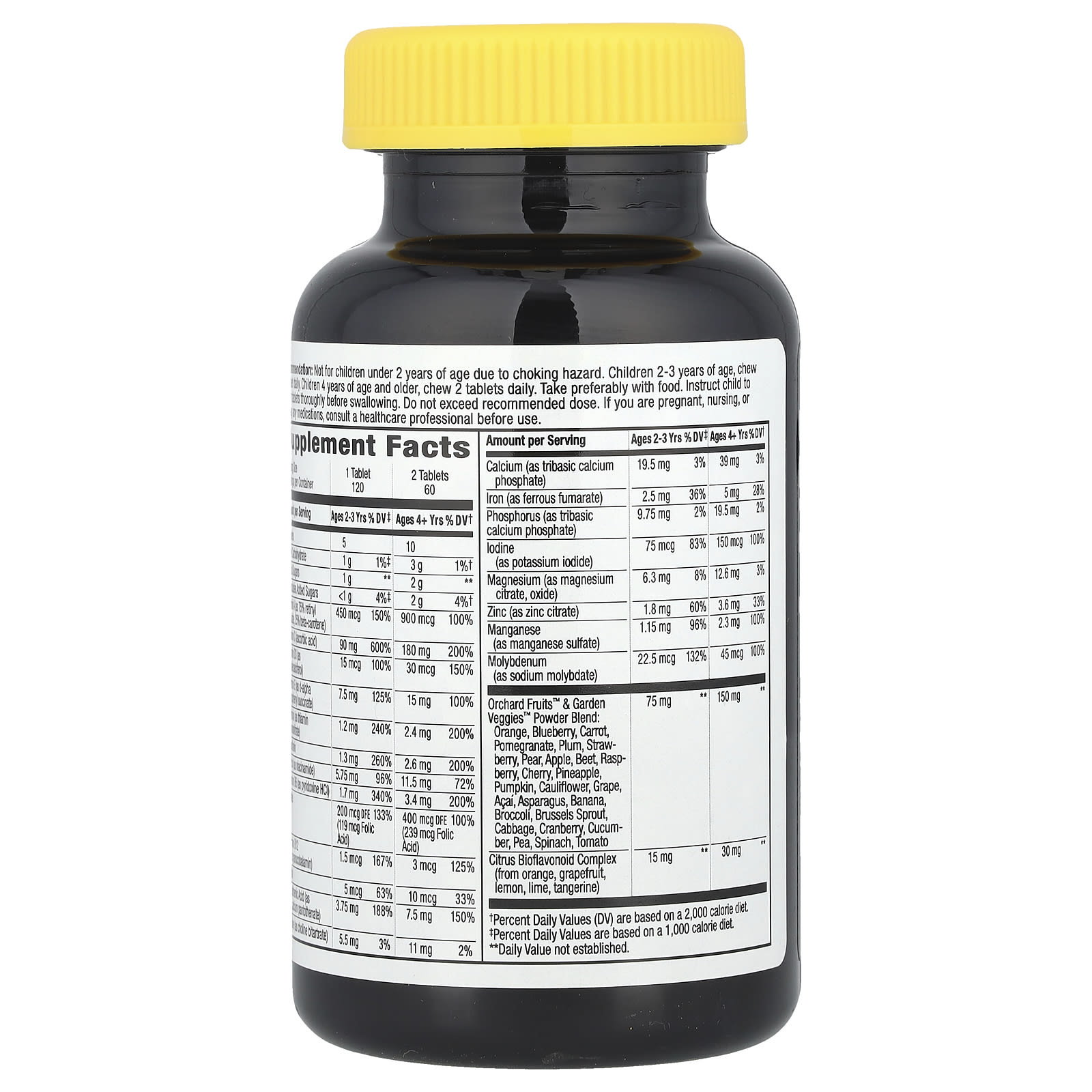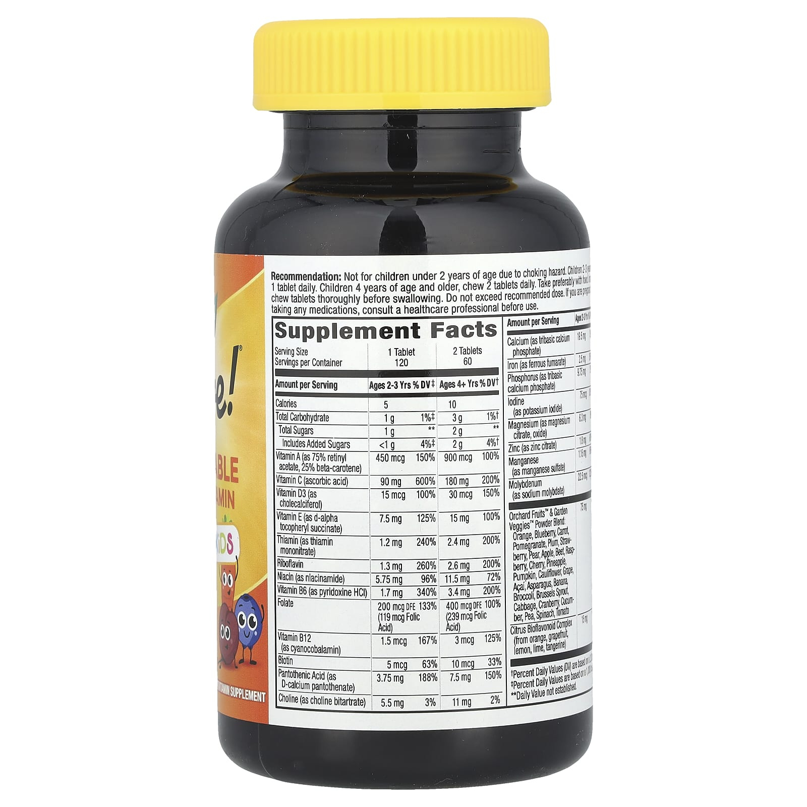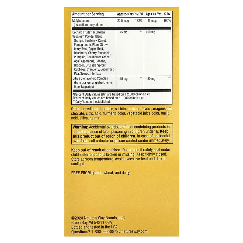 The Orchard Fruits™ & Garden Veggies™ blend includes a variety of fruits and vegetables (orange, blueberry, carrot, pomegranate, plum, strawberry, pear, apple, beet, raspberry, cherry, pineapple, pumpkin, cauliflower, grape, açaí, asparagus, banana, broccoli, Brussels sprout, cabbage, cranberry, cucumber, pea, spinach, tomato). For 2-3 years, 75 mg is included, and for 4+ years 150 mg, supporting the intake of plant compounds, useful especially when children are selective with vegetables or fruits.