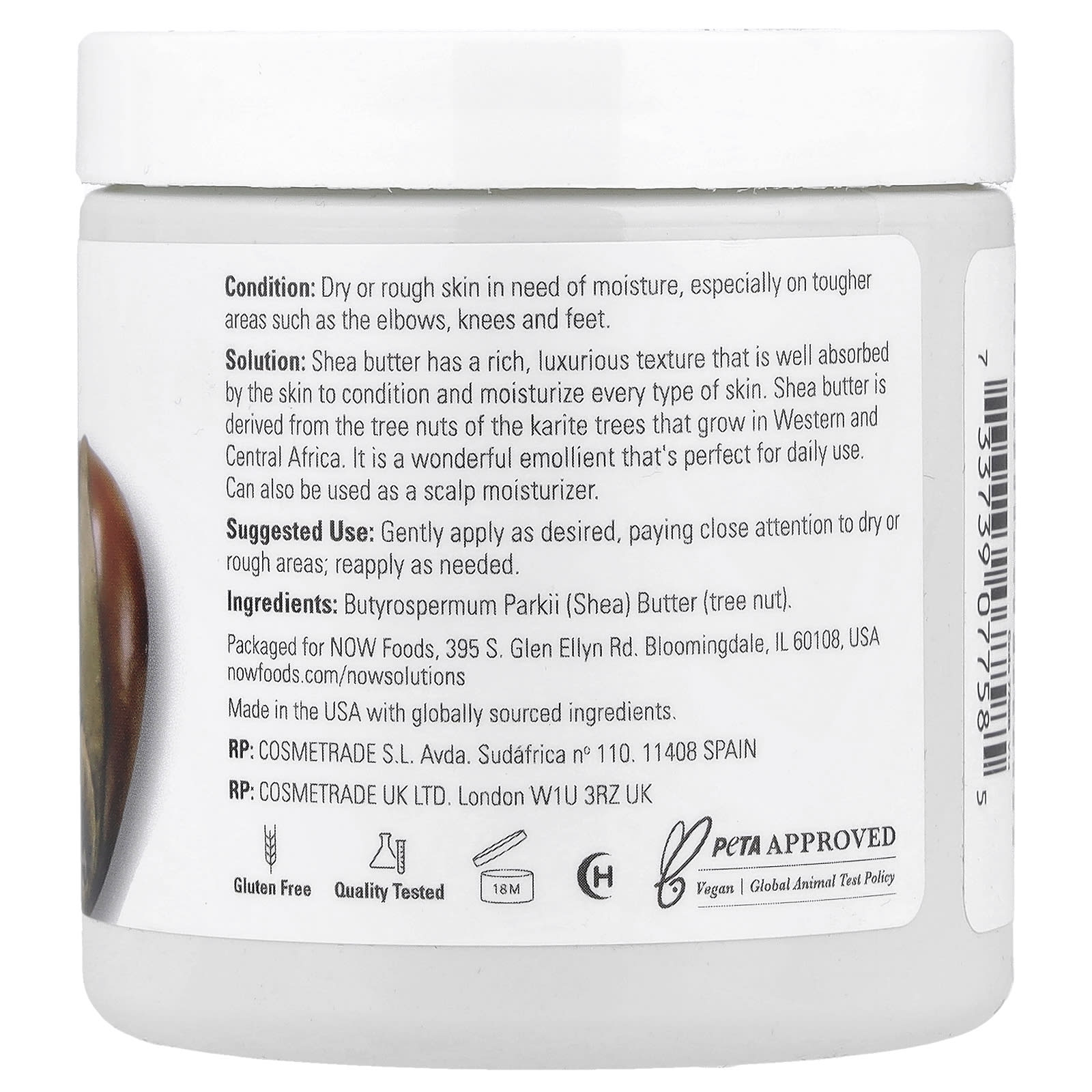 Shea Butter Solutions, NOW Foods is a cosmetic product with a simple and effective formula, based on shea butter (Butyrospermum parkii), recognized for its emollient, nourishing and skin-protective properties. Shea butter is obtained from the nuts of the shea tree and is notable for its rich composition of fatty acids and unsaponifiable fractions, which contribute to deep hydration, maintaining elasticity and supporting the natural processes of restoring the skin barrier. The dense, "melting" texture makes it suitable for dry, rough or externally exposed areas, providing a comfortable layer of protection and a sensation of supple and velvety skin.