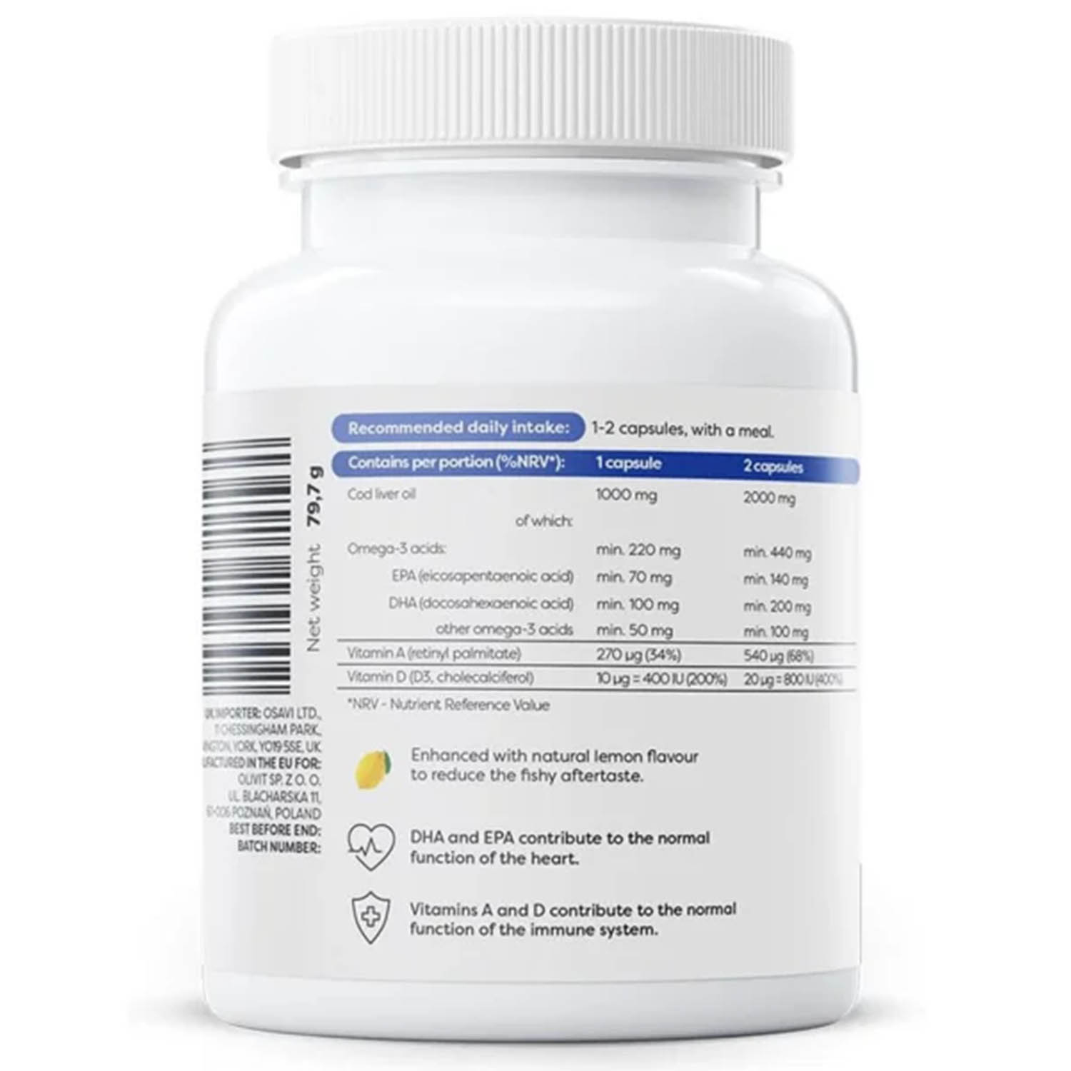 Norwegian Cod Liver Oil 1000 mg, Osavi is a Nordic-quality cod liver oil, formulated to support the cardiovascular system, cognitive and visual functions, immunity, and the health of bones and muscles. Each serving provides 1000 mg of cod liver oil, with a balanced profile of omega-3 fatty acids and fat-soluble vitamins: DHA (docosahexaenoic acid) min. 100 mg, EPA (eicosapentaenoic acid) min. 70 mg, other omega-3 fatty acids min. 50 mg — total omega-3 min. 220 mg. The formula is complemented by vitamin A 270 μg (34%) and vitamin D3 10 μg = 400 IU (200%), for coherent support of vision, immunity, skin, bones, and muscles. Norwegian origin and clear standardization of content provide confidence in purity, traceability, and consistent potency, serving after serving.