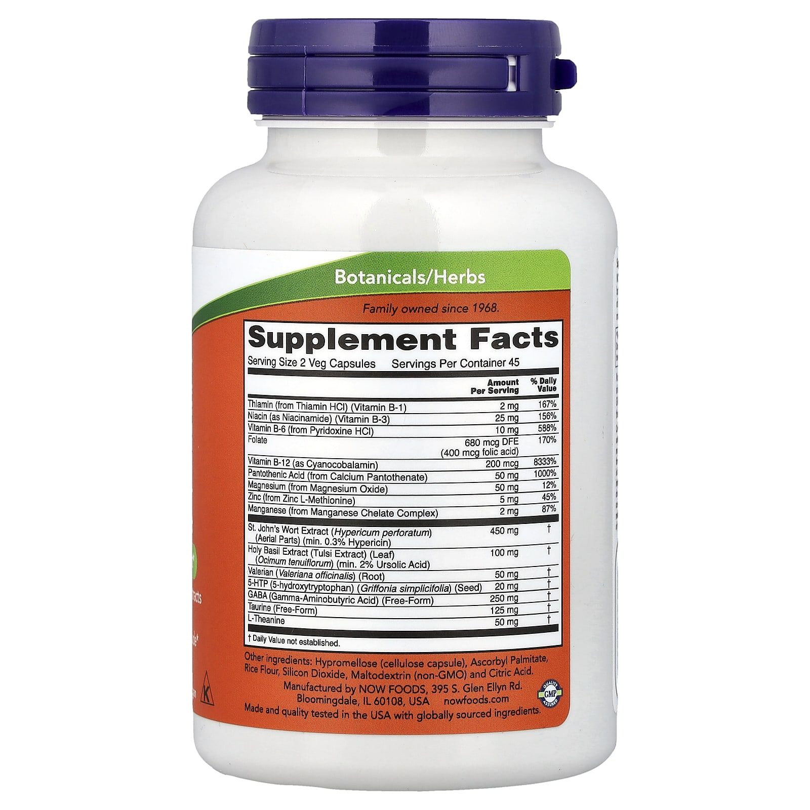 Mood Support with St. John’s Wort, Now Foods is an intelligent complex created to support emotional balance, stress resilience, sleep quality and mental clarity. Each serving combines key nutrients for the nervous system – B vitamins and essential minerals – with an anxiolytic & adaptogenic phytocomplex: St. John’s Wort Extract (Hypericum perforatum) 450 mg (min. 0.3% hypericin), Tulsi Extract (Holy Basil) 100 mg (min. 2% ursolic acid), Valerian 50 mg, plus functional mediators of relaxation and “active calm”: GABA 250 mg, Taurine 125 mg, L-theanine 50 mg, 5-HTP 20 mg. The matrix is supported by Thiamine (B1) 2 mg – 167% NRV, Niacin (B3) 25 mg – 156% NRV, Vitamin B6 10 mg – 588% NRV, Folate 680 mcg DFE (400 mcg folic acid) – 170% NRV, Vitamin B12 200 µg – 8333% NRV, Pantothenic acid (B5) 50 mg – 1000% NRV, as well as Magnesium 50 mg – 12% NRV, Zinc 5 mg – 45% NRV and Manganese 2 mg – 87% NRV. The synergy of these elements supports the neurochemical “background” responsible for mood, focus and rest.