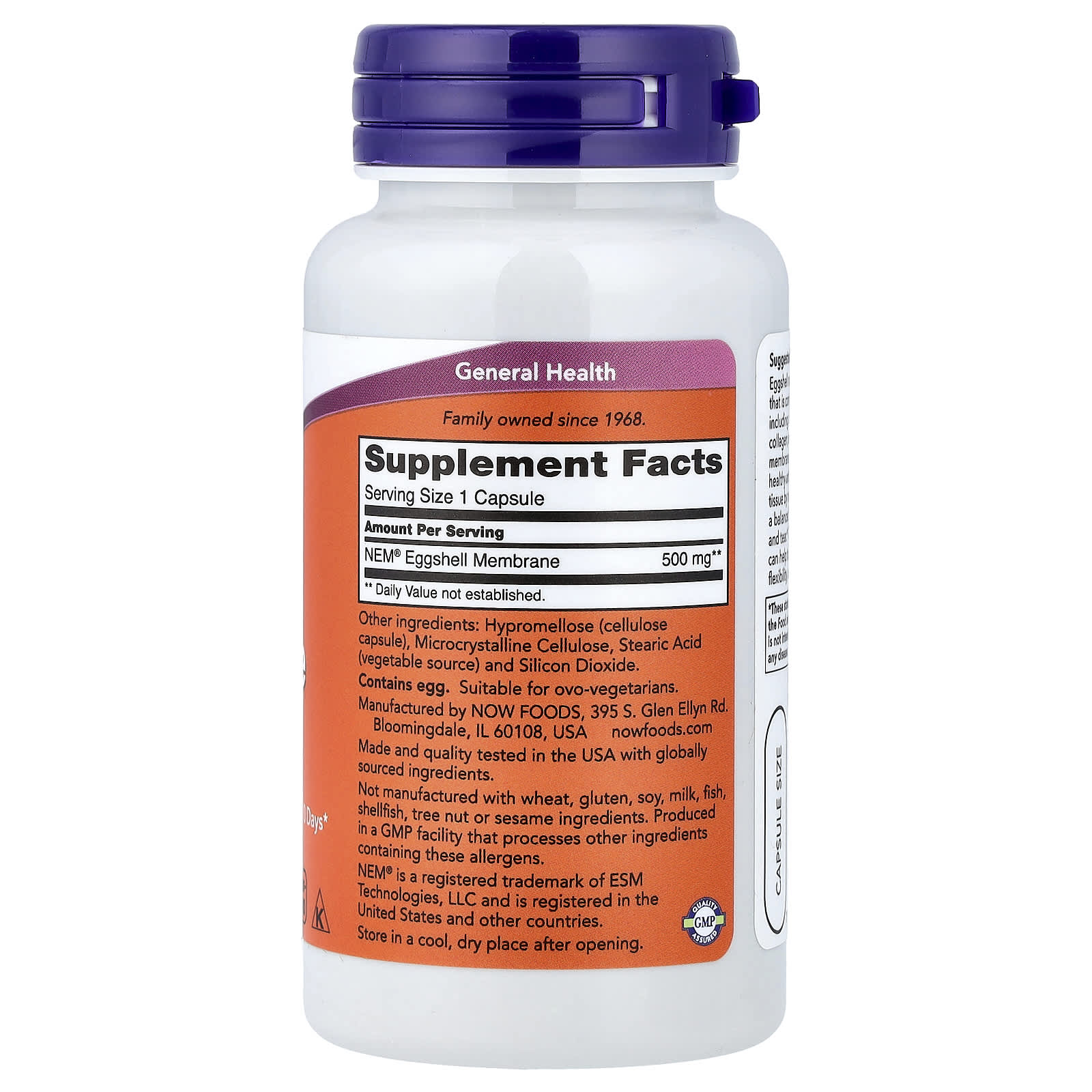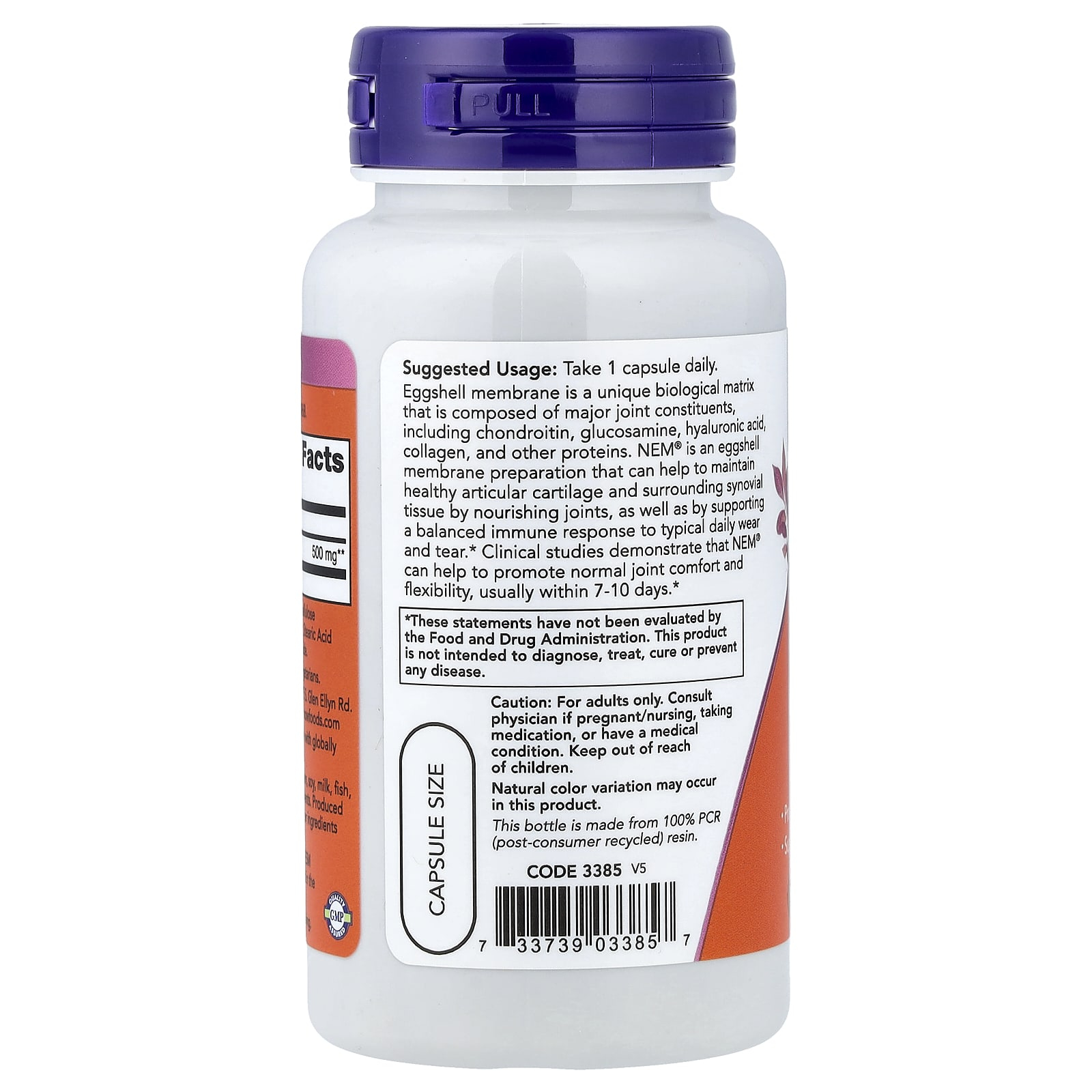 Eggshell Membrane (Eggshell NEM®) 500 mg, Now Foods is a premium dietary supplement, formulated for supporting joint health, maintaining flexibility and improving comfort during movement. The active ingredient, eggshell membrane NEM® (Natural Eggshell Membrane), is a complex natural source of collagen, elastin, glycosaminoglycans, hyaluronic acid and other structural proteins essential for connective tissue integrity.