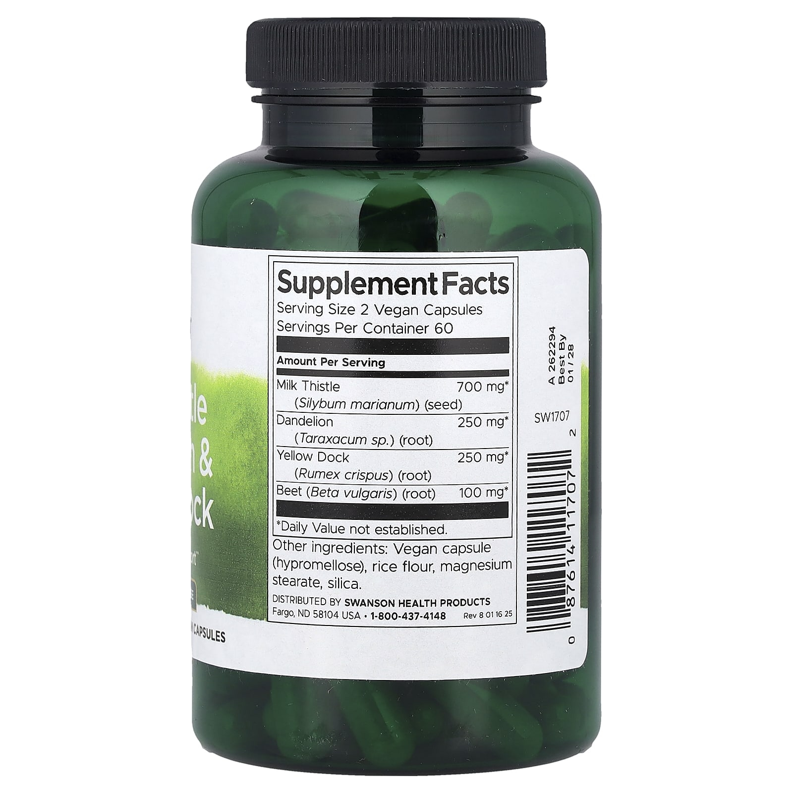 Milk Thistle Dandelion & Yellow Dock, Swanson is a complex dietary supplement, formulated based on traditional plants known for supporting liver, gallbladder and digestive system. Each serving provides a concentrated blend of milk thistle (Silybum marianum) – 700 mg, dandelion (Taraxacum sp.) – 250 mg, yellow dock (Rumex crispus) – 250 mg and beetroot (Beta vulgaris) – 100 mg, in a carefully chosen combination to support detoxification, metabolism and general body vitality.