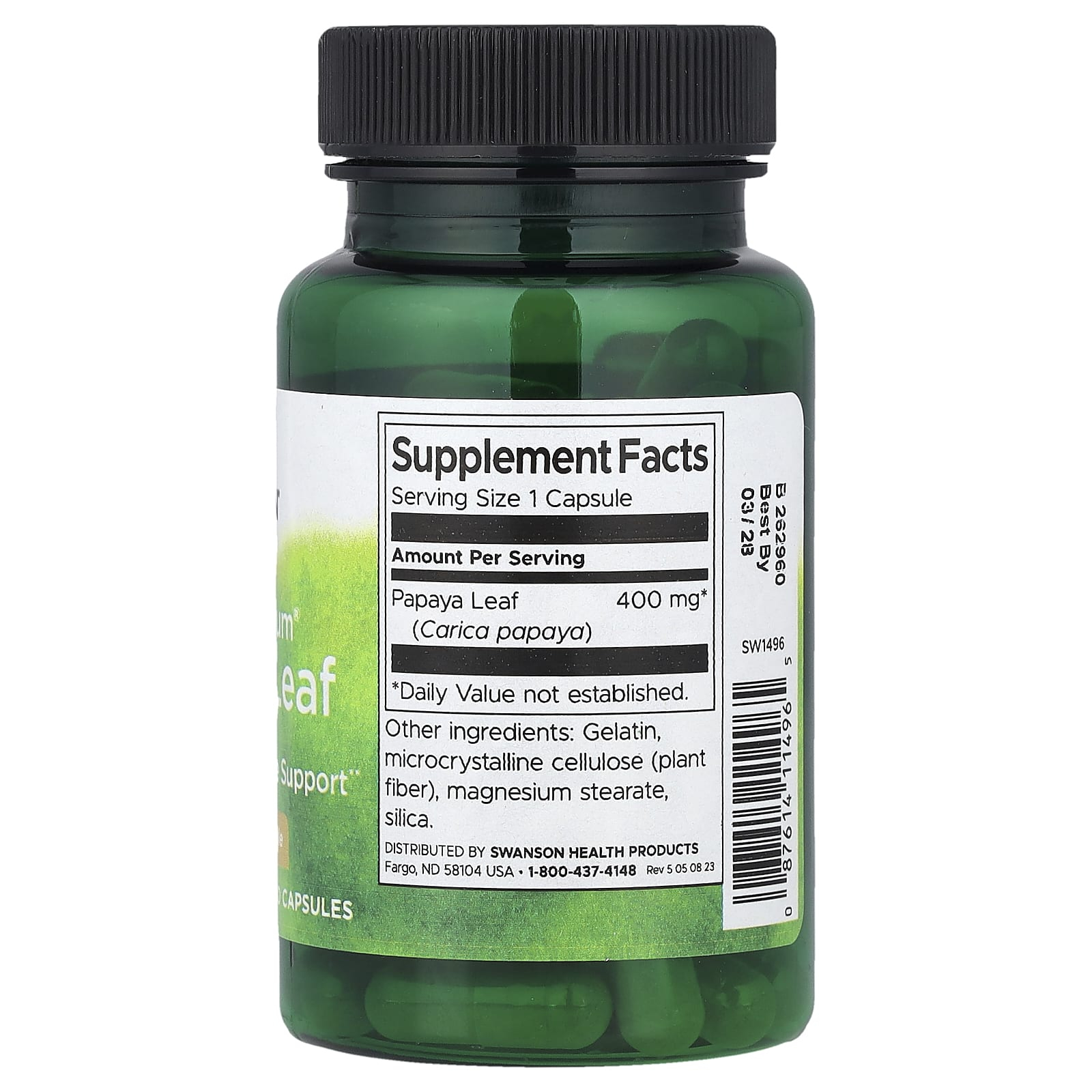 Full Spectrum Papaya Leaf, 400 mg, Swanson is a plant-based dietary supplement, formulated to support the immune system, antioxidant balance and digestive comfort, through the use of papaya leaf (Carica papaya) in a dose of 400 mg. Unlike papaya fruit, known mainly for digestive enzymes and micronutrient content, papaya leaf is appreciated in phytotherapy for its complex phytochemical profile: phenolic compounds, flavonoids, specific alkaloids, plant enzymes and substances with potential to support the body's natural defense mechanisms.