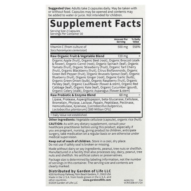 Vitamin Code RAW Vitamin C, Garden of Life is a complex formula, oriented towards immunity, collagen and antioxidant protection, differentiated by vitamin C from S. cerevisiae culture, organic fruit and vegetable matrix, citrus bioflavonoids and enzyme + probiotic combination for digestion support and efficient nutrient utilization.