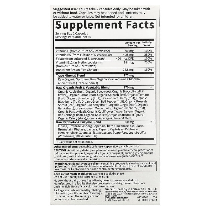 Healthy Blood™ Vitamin Code, Garden of Life este o formulă premium pentru susținerea sănătății sângelui, construită pe baza filozofiei „whole food”. Fiecare porție livrează nutrienții-cheie în forme blânde și eficiente: Vitamina C 90 mg (100%) pentru absorbția fierului, Vitamina B6 4,25 mg (250%) pentru metabolismul proteinelor și formarea hemului, Folat 400 µg DFE (100%) și Vitamina B12 metilcobalamină 18 µg (750%) pentru susținerea eritropoiezei, plus Fier 28,8 mg (160%) din chelat de orez brun – o sursă cunoscută pentru toleranța sa digestivă. Sinergia este amplificată de Amestecul de minerale în urme (Spirulină organică crudă, Chlorella organică crudă cu pereți crăpați, Turbă antică – 175 mg), un Amestec crud de fructe și legume organice (170 mg) și un Amestec crud de probiotice & enzime (60 mg; L. bulgaricus & L. plantarum – 500 milioane CFU, alături de un spectru enzimatic digestiv). Rezultatul: sprijin cuprinzător pentru transportul oxigenului, energie, imunitate și confort digestiv, într-o matrice alimentară naturală.