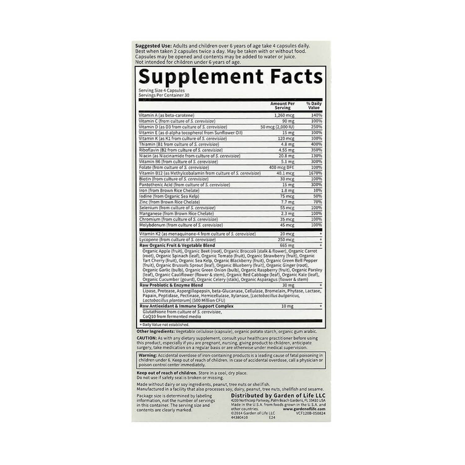 Whole Food Multivitamin Family, Garden of Life este o formulă premium „whole food”, gândită pentru a susține nevoile nutriționale ale întregii familii, de la diminețile aglomerate până la activitățile de după-amiază. Fiecare porție livrează micronutrienți-cheie în doze funcționale și forme prietenoase cu organismul: Vitamina A (beta-caroten) 1.260 mcg (140%), Vitamina C 90 mg (100%), Vitamina D3 50 mcg/2.000 UI (250%), Vitamina E 15 mg (100%), Vitamina K1 120 µg (100%) + K2 (menachinonă-4) 20 µg, complexul de B-uri din culturi alimentare (B1 4,8 mg – 400%, B2 4,55 mg – 350%, Niacină 20,8 mg – 130%, B6 5,1 mg – 300%, Folat 400 µg DFE – 100%, B12 metilcobalamină 40,1 µg – 1.670%, Biotină 30 µg – 100%, Acid pantotenic 15 mg – 300%), plus minerale esențiale: Fier 1,8 mg (10%), Iod 75 µg (50%), Zinc 7,7 mg (70%), Seleniu 55 µg (100%), Mangan 2,3 mg (100%), Crom 35 µg (100%) și Molibden 45 µg (100%). Sinergia nutrienților este consolidată de un Amestec crud de fructe & legume organice (665 mg), un Amestec crud de probiotice & enzime (30 mg; 500 milioane CFU L. bulgaricus & L. plantarum, plus un spectru de enzime digestive) și un Complex antioxidant & imunitar (Glutation + CoQ10, 10 mg). Formula include și Licopen (250 µg) din culturi nutriționale – un carotenoid valoros pentru protecție celulară.
