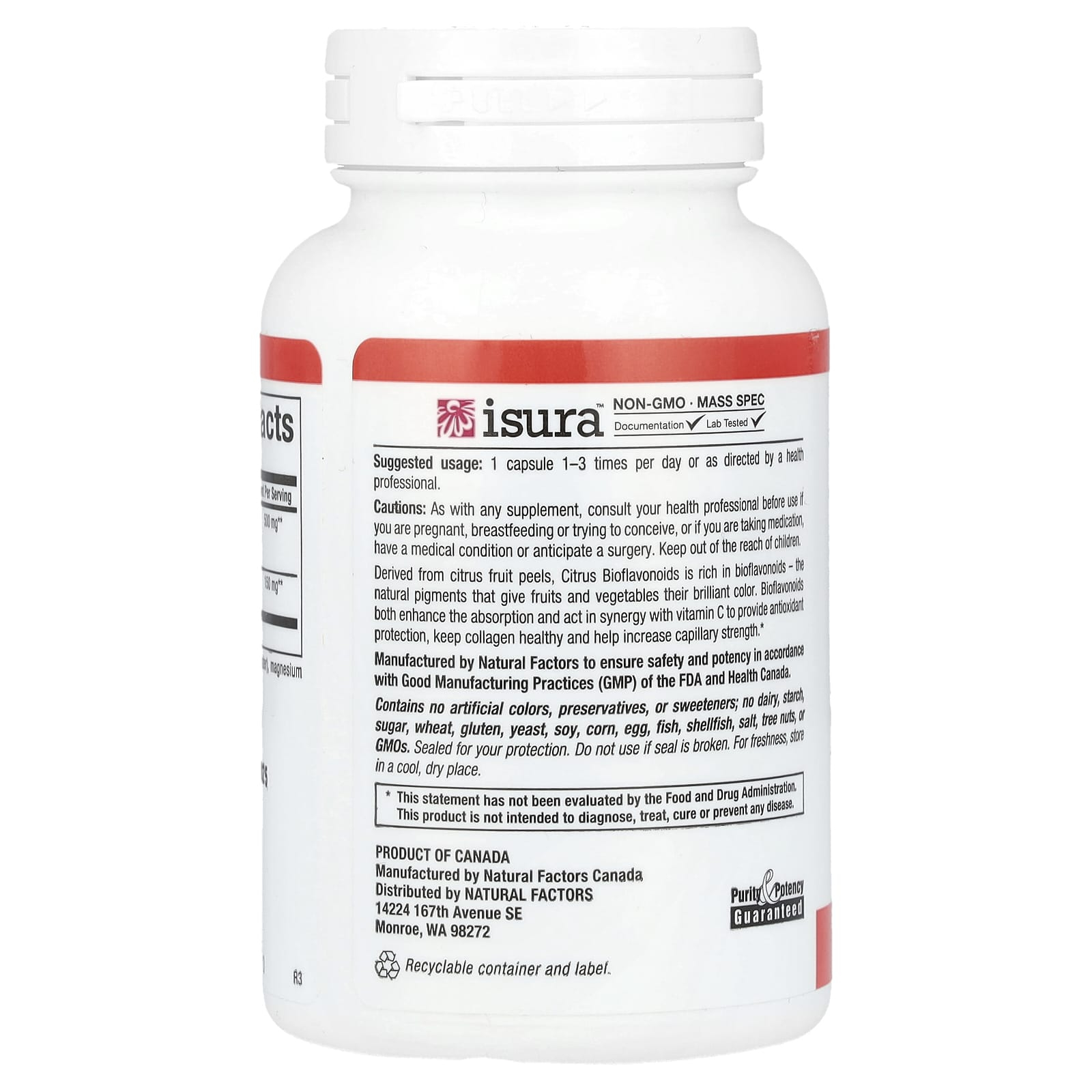 Citrus Bioflavonoids Plus Hesperidin, 650 mg, de la Natural Factors este un supliment avansat formulat pe baza unui extract standardizat de bioflavonoide citrice și hesperidină, obținute din coaja fructelor de citrice precum lămâie (Citrus limon), portocală (Citrus sinensis), grapefruit (Citrus paradisi), mandarină (Citrus reticulata) și lime (Citrus aurantifolia). Cu o concentrație de 500 mg de bioflavonoide citrice și 150 mg de hesperidină, acest produs oferă un suport sinergic excepțional pentru sănătatea capilarelor, protecția antioxidantă, funcția imunitară și echilibrul inflamator.
