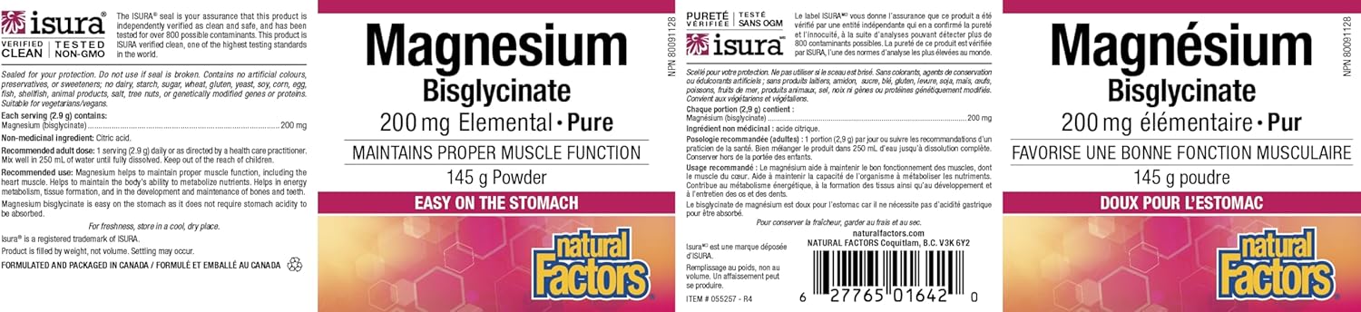 Magnesium Bisglycinate Powder, 200 mg, Natural Factors furnizează magneziu elementar sub formă chelatată – bisglicinat de magneziu – recunoscută pentru biodisponibilitatea ridicată și toleranța digestivă excelentă. Fiecare porție oferă 200 mg magneziu (48% VNR), într-un praf ușor de dizolvat, cu dozare flexibilă și integrare simplă în rutina zilnică. Magneziul este cofactor în peste 300 de reacții enzimatice, esențial pentru producția de energie (ATP), echilibrul electrolitic, funcția musculară și nervoasă, sinteza proteinelor, menținerea oaselor și a stării psihologice normale. Formula pune accent pe confortul utilizării (pudră), absorbție eficientă (chelat bisglicinat) și efecte funcționale vizibile în ritmul de viață modern.