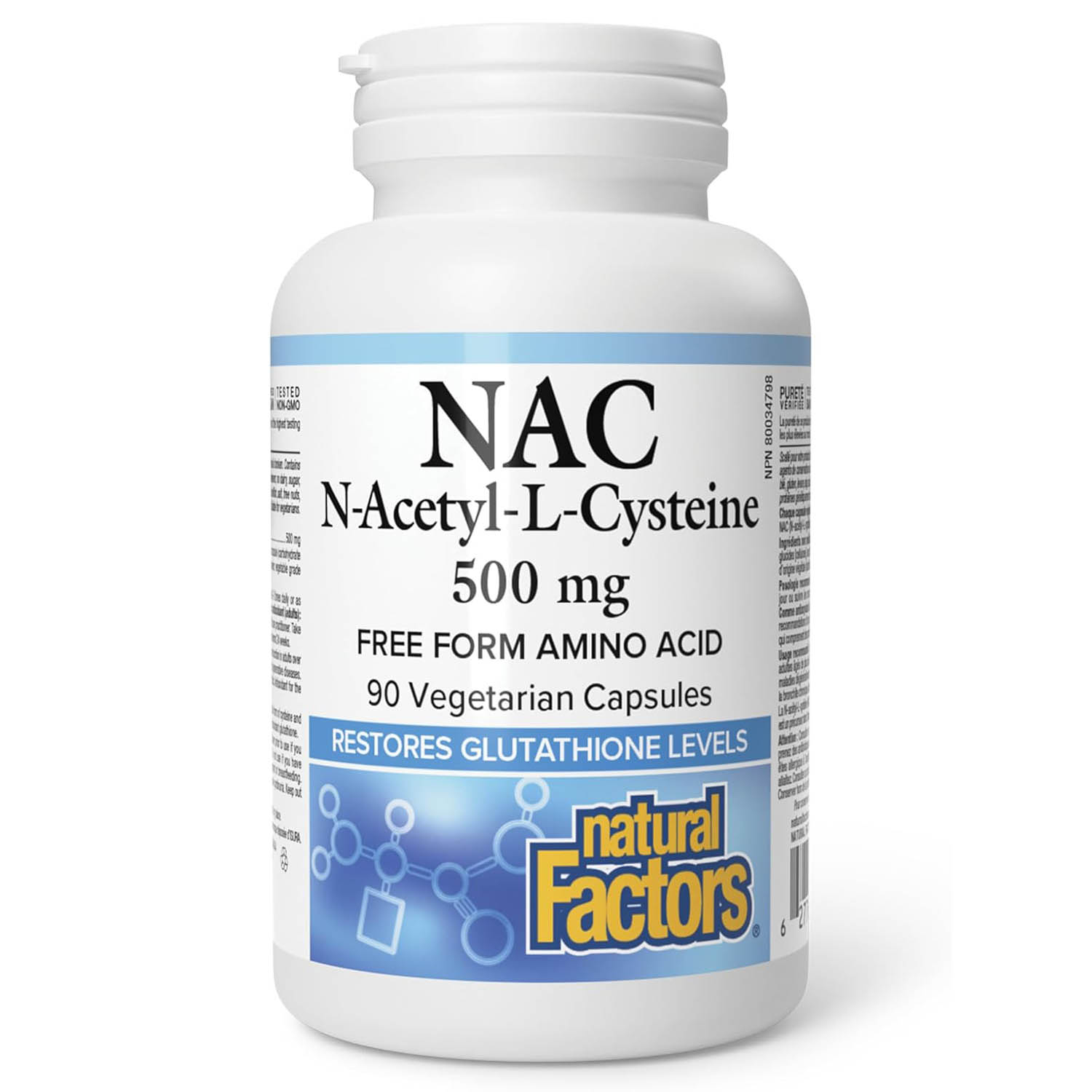 NAC (N-Acetyl-L-Cysteine) 500 mg, Natural Factors este un supliment alimentar premium care furnizează 500 mg de N-acetil-L-cisteină, o formă stabilă și biodisponibilă a aminoacidului L-cisteină. NAC este cunoscută în mod special pentru rolul său în susținerea producerii de glutation, unul dintre cei mai importanți antioxidanți endogeni ai organismului, implicat în protecția celulară, detoxifiere și menținerea sănătății ficatului, a plămânilor și a sistemului imunitar.
