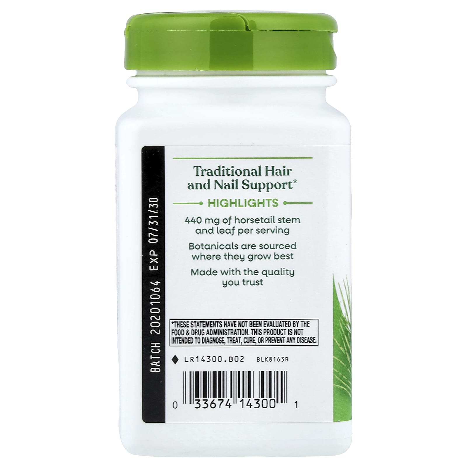 Horsetail Grass, 440 mg, Nature’s Way este un supliment alimentar natural care conține tulpina și frunza plantei coada-calului (Equisetum arvense). Coada-calului este o plantă perenă cunoscută pentru proprietățile sale remarcabile în sprijinirea sănătății generale datorită conținutului său bogat de minerale și compuși activi esențiali.