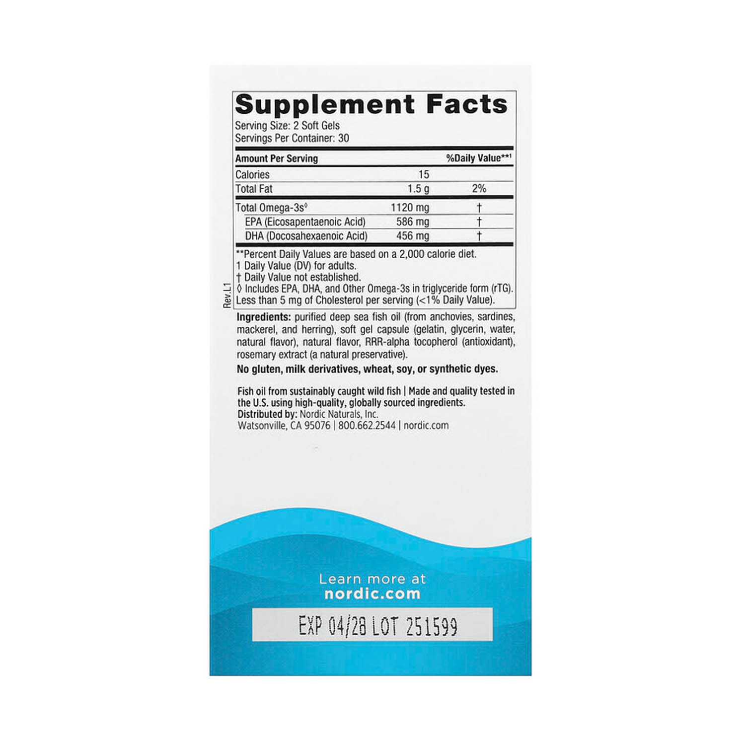 Ultimate Omega® Minis, 1120 mg, Nordic Naturals este un supliment alimentar premium cu acizi grași omega-3 concentrați, formulat special pentru cei care își doresc beneficiile complete ale uleiului de pește de calitate superioară, într-un format mai ușor de utilizat: capsule mini. Produsul furnizează un total de 1120 mg omega-3, cu o doză solidă de EPA (586 mg) și DHA (456 mg), doi acizi grași esențiali implicați în funcționarea optimă a inimii, creierului, ochilor și în menținerea unui răspuns inflamator echilibrat.