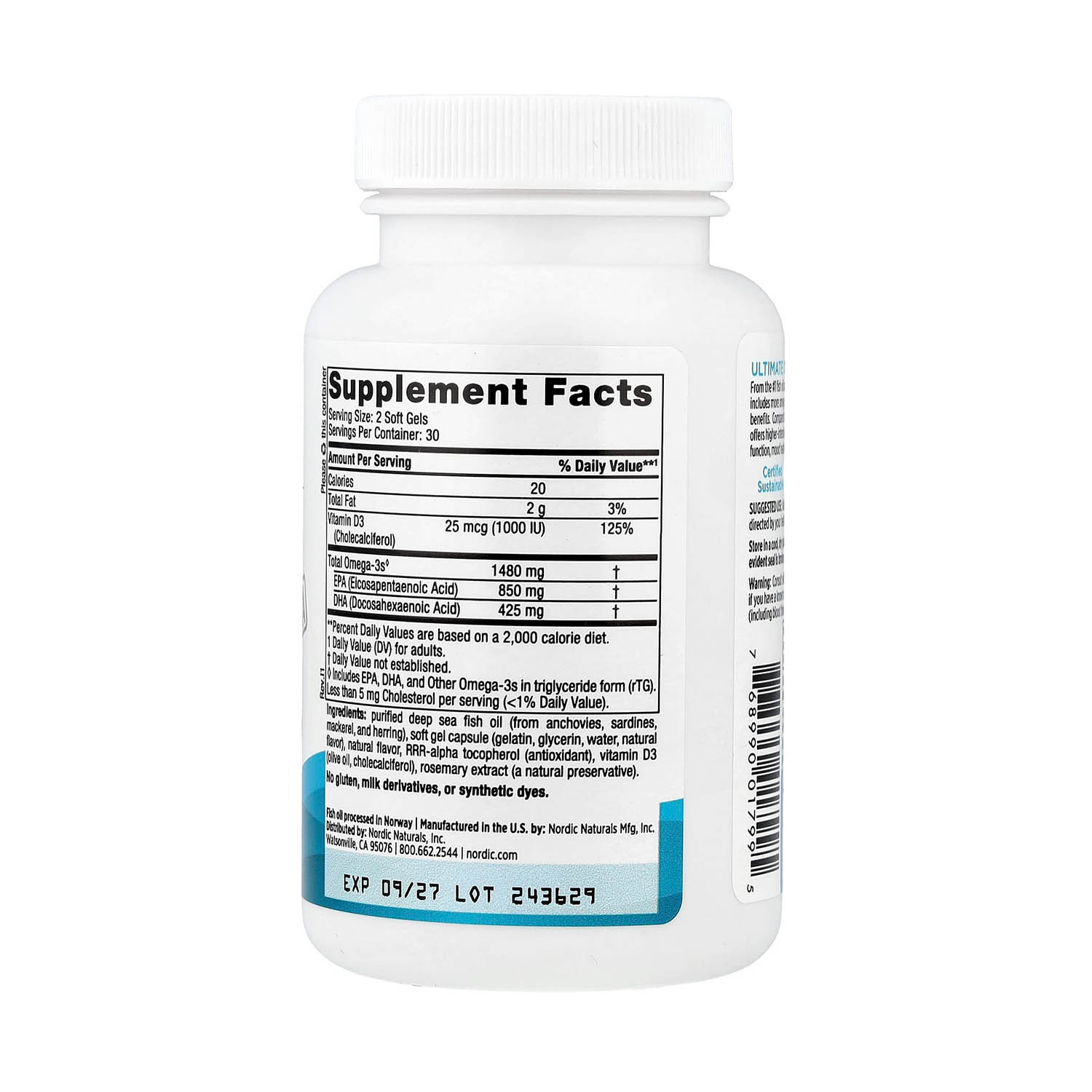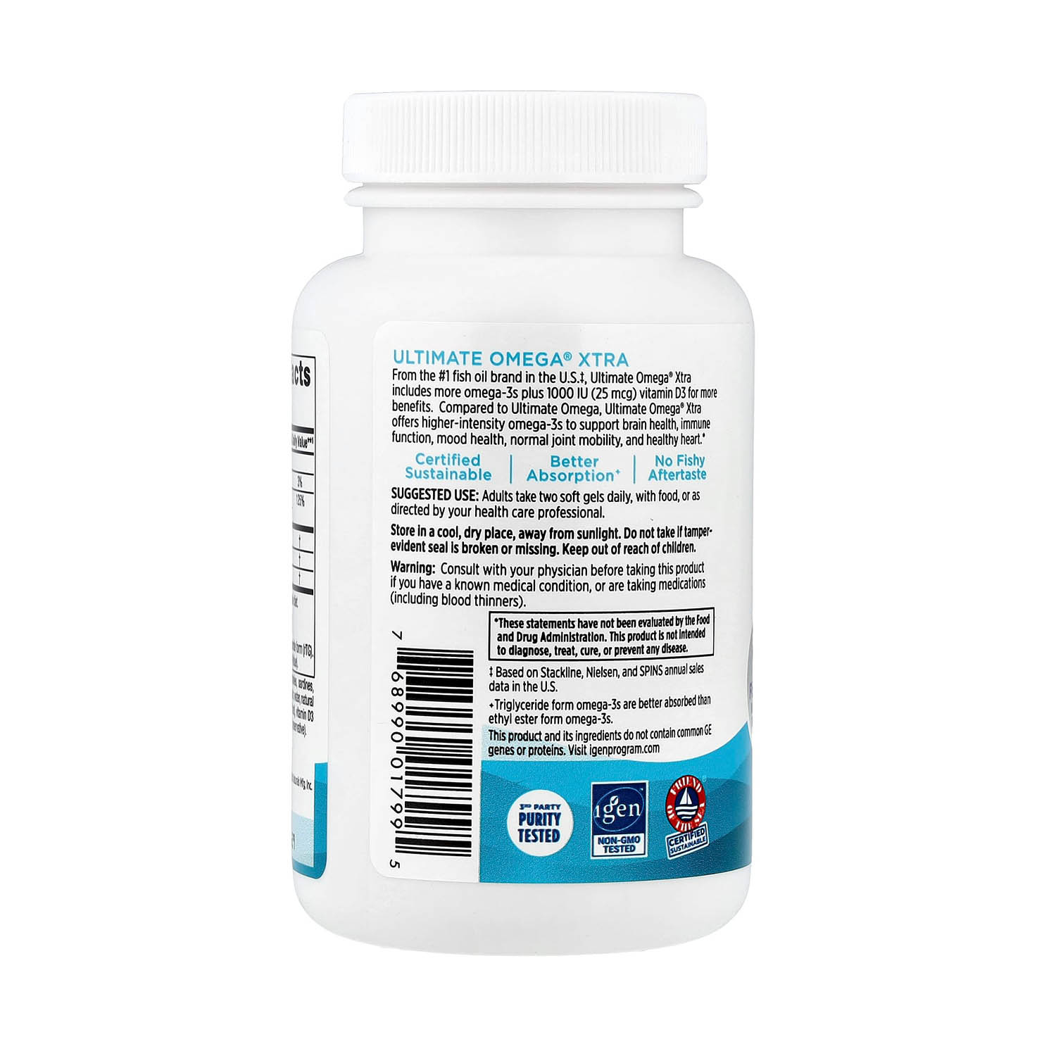 Ultimate Omega® Xtra, 1480 mg, Nordic Naturals este un supliment alimentar premium, formulat pentru a furniza o doză foarte concentrată de acizi grași omega-3 (EPA și DHA) împreună cu vitamina D3 (colecalciferol), într-o combinație orientată către sănătatea inimii, echilibrul inflamator și susținerea funcțiilor cognitive. Formula oferă 1480 mg omega-3 total, cu un aport dominant de EPA (850 mg) și un aport substanțial de DHA (425 mg), completate de vitamina D3 25 mcg (1000 UI). Această structură este relevantă pentru persoanele care urmăresc un suport cardiovascular puternic și un control mai bun al inflamației, fără a neglija funcția neurologică și susținerea imunitară.