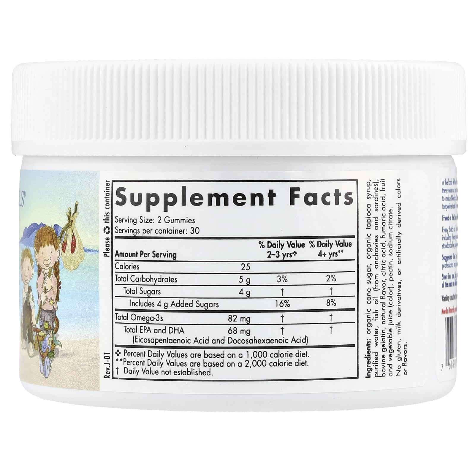 Nordic Omega-3 Gummies, 82 mg, Nordic Naturals este un supliment alimentar sub formă de jeleuri, conceput pentru a oferi un aport ușor de integrat în rutină de acizi grași omega-3, în special EPA și DHA, nutrienți esențiali pentru funcționarea optimă a creierului, a sistemului cardiovascular și a vederii. Fiecare porție furnizează Omega-3 total 82 mg, din care EPA + DHA total 68 mg (acid eicosapentaenoic și acid docosahexaenoic). Formula are, de asemenea, un profil energetic clar: 25 calorii, carbohidrați totali 5 g, dintre care zahăr total 4 g, incluzând 4 g zaharuri adăugate.