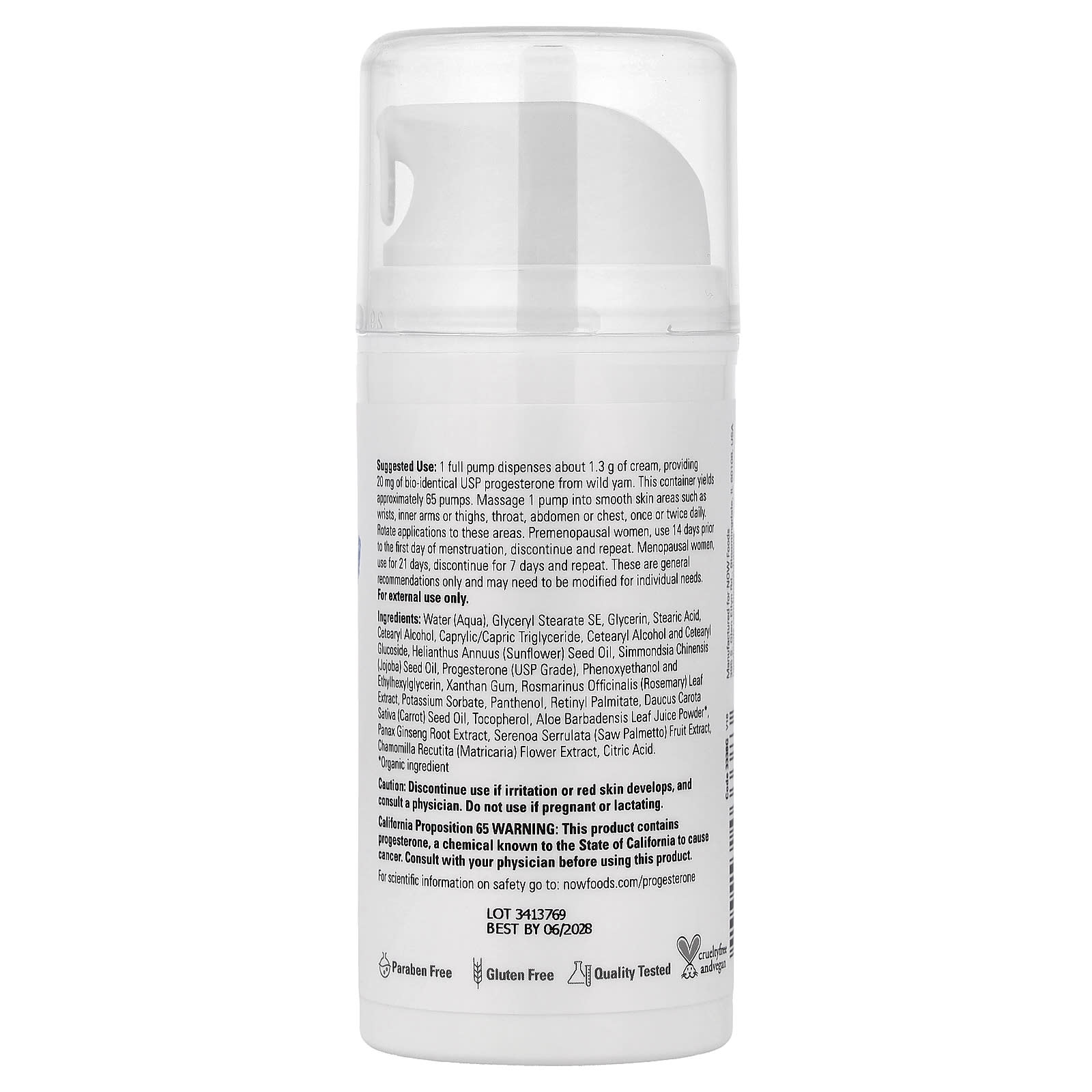 Progesterone from Wild Yam, Balancing Skin Cream este o cremă premium concepută pentru a susține echilibrul natural al organismului și pentru a îngriji pielea în același timp. Fiecare apăsare a pompei livrează 20 mg progesteron natural (grad USP), într-o bază catifelată, ușor de întins, formulată cu emolienți și antioxidanți de calitate: glicerină, trigliceride caprilice/caprice (MCT), ulei de semințe de floarea-soarelui, ulei de jojoba, tocoferol (vitamina E – fără soia) și palmitat de retinil (vitamina A). Complexul botanic inteligent – aloe vera, extract de frunze de rozmarin, ginseng, saw palmetto, mușețel și o notă discretă de lemongrass – completează experiența cu efecte de calmare, protecție și revigorare a pielii. Formula este fără coloranți artificiali, fără parfumuri adăugate, fără parabeni, fără gluten, vegană și netestată pe animale, iar calitatea este atent verificată.