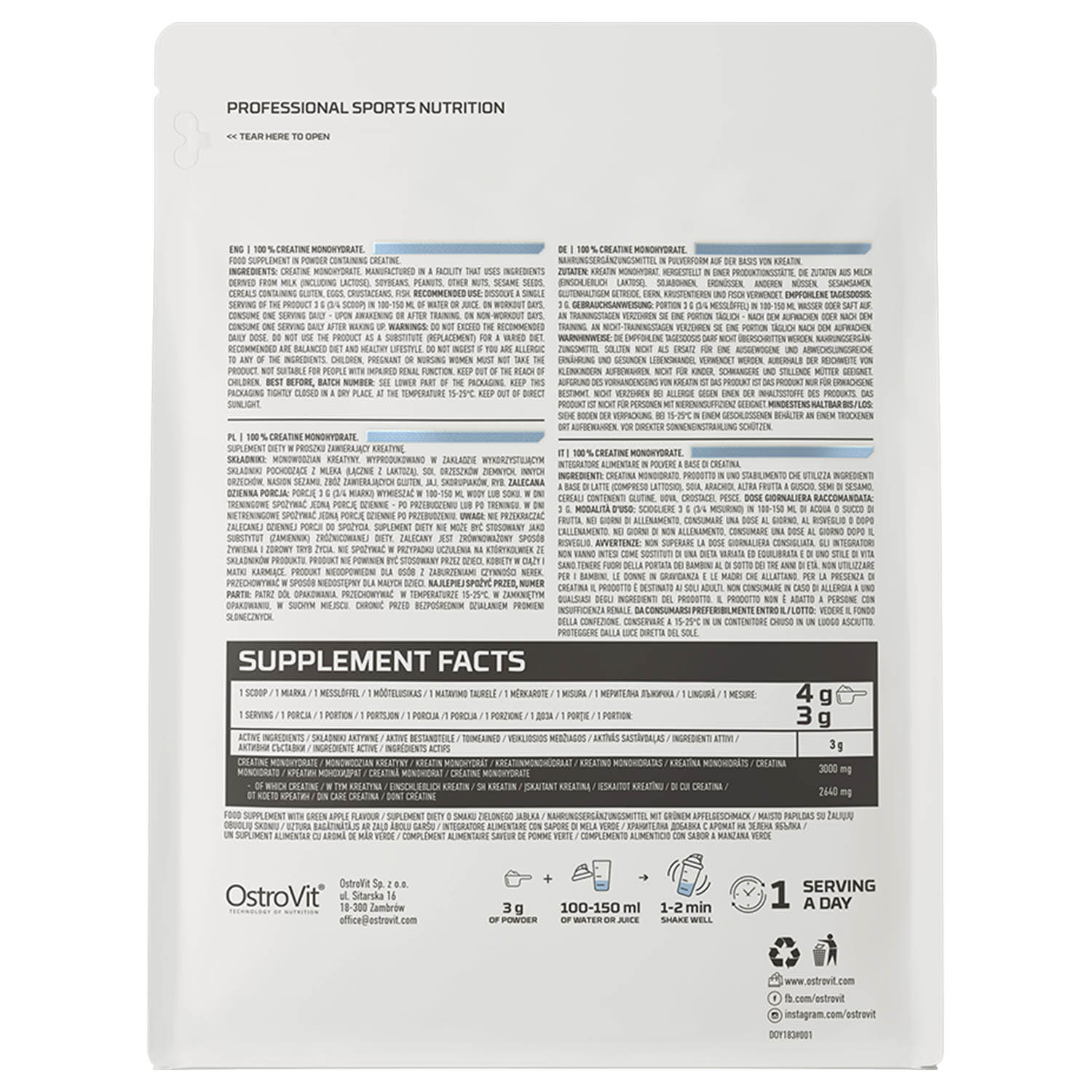 OstroVit Creatine Monohydrate fără aromă este o formulă simplă, curată și versatilă, potrivită pentru sportivi de forță, culturism, cross-training, sporturi de echipă sau pentru oricine își dorește un plus de performanță și o strategie eficientă de susținere a adaptărilor musculare.