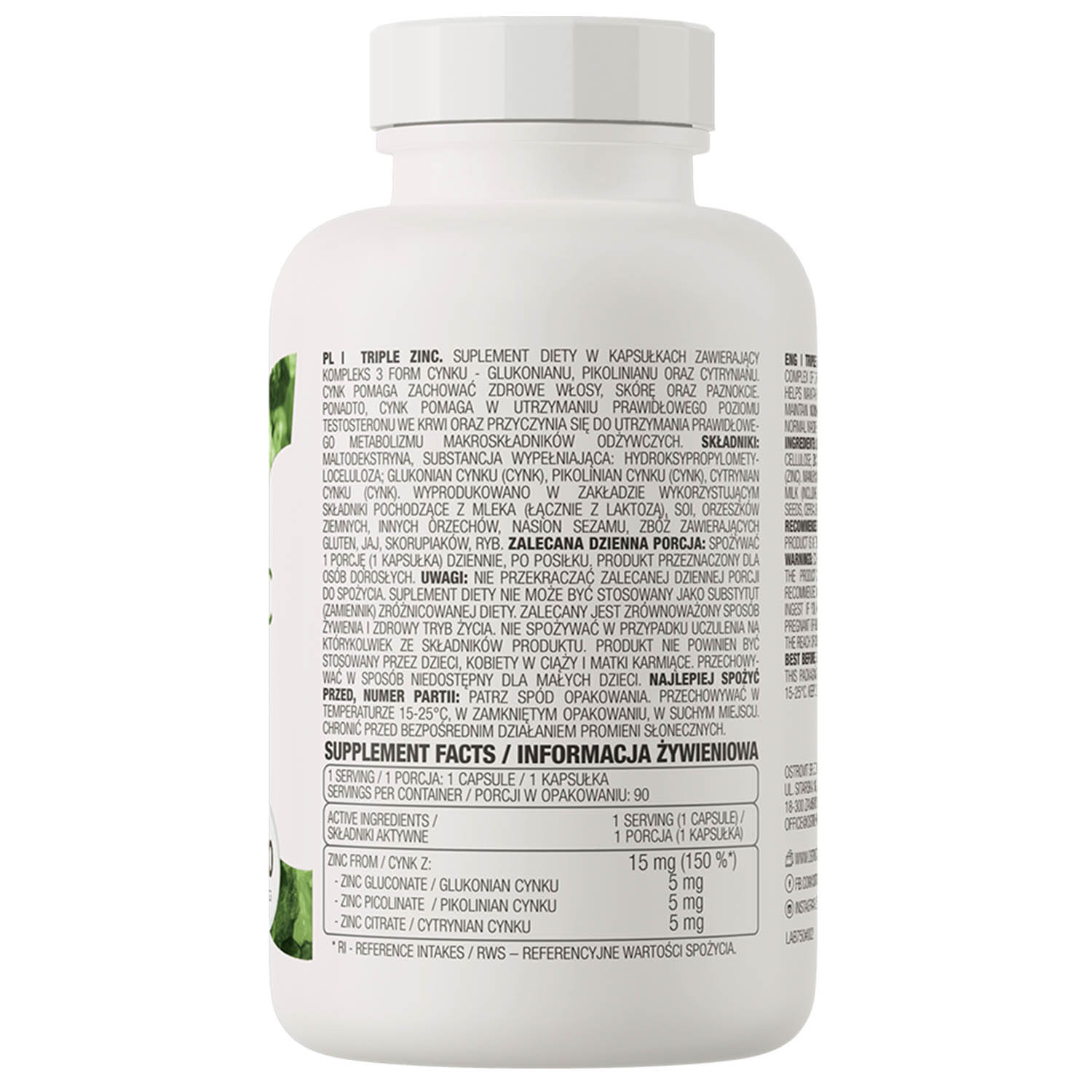 Triple Zinc 15 mg, OstroVit este un supliment alimentar premium care conține trei forme complementare de zinc – gluconat de zinc, picolinat de zinc și citrat de zinc – concepute pentru a oferi o absorbție optimă și o biodisponibilitate ridicată. Zincul este un mineral esențial implicat în numeroase procese biologice din organism, contribuind la funcționarea normală a sistemului imunitar, la sănătatea pielii, la metabolismul celular și la protecția antioxidantă.