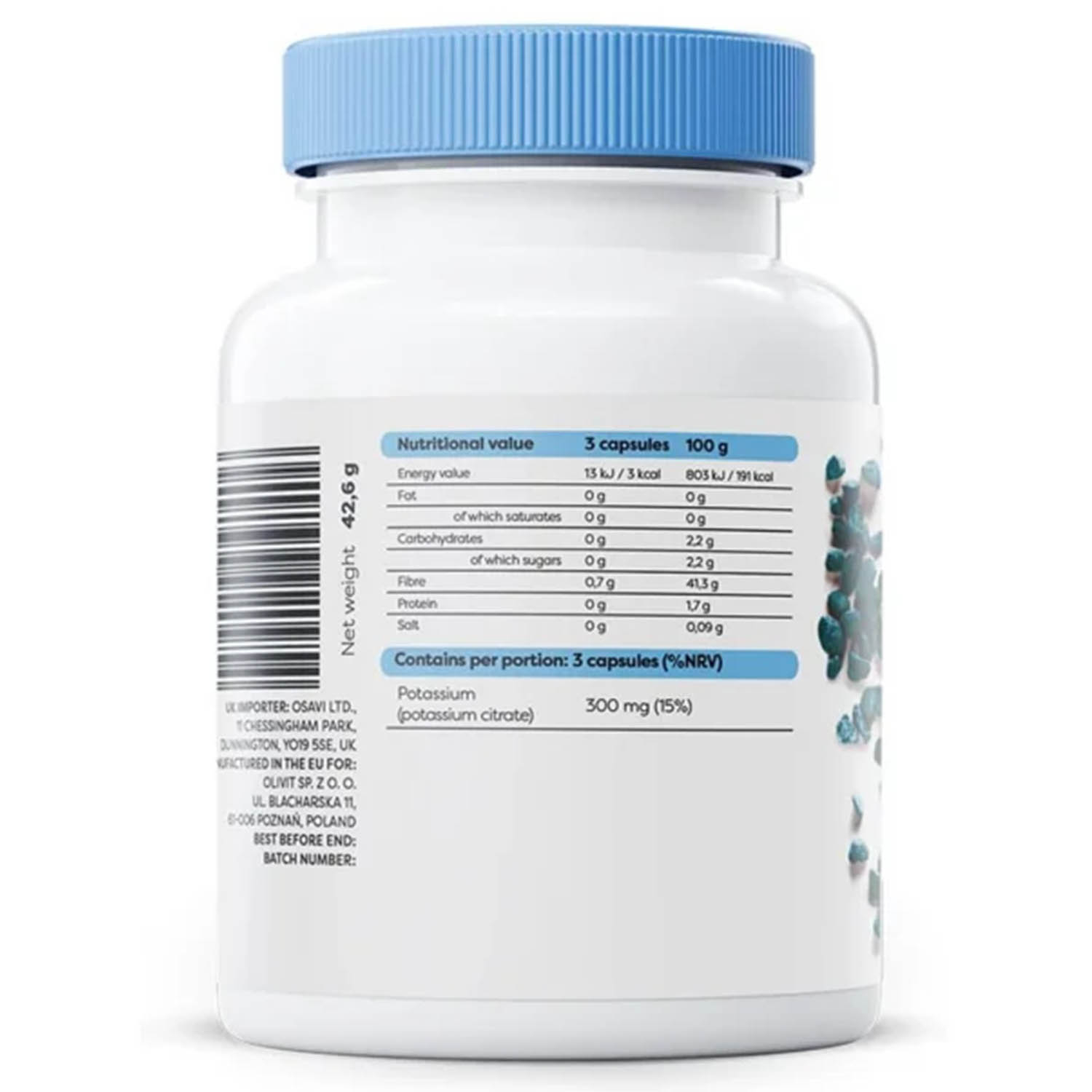 Potasiu, 300 mg, Osavi este un supliment alimentar care conține potasiu sub formă de citrat de potasiu. Acest mineral esențial este unul dintre cei mai importanți electroliți pentru organism, având un rol crucial în funcționarea corectă a mușchilor, sistemului nervos și a inimii. Potasiul este esențial pentru menținerea echilibrului hidroelectrolitic și contribuie la buna funcționare a multor procese fiziologice vitale.