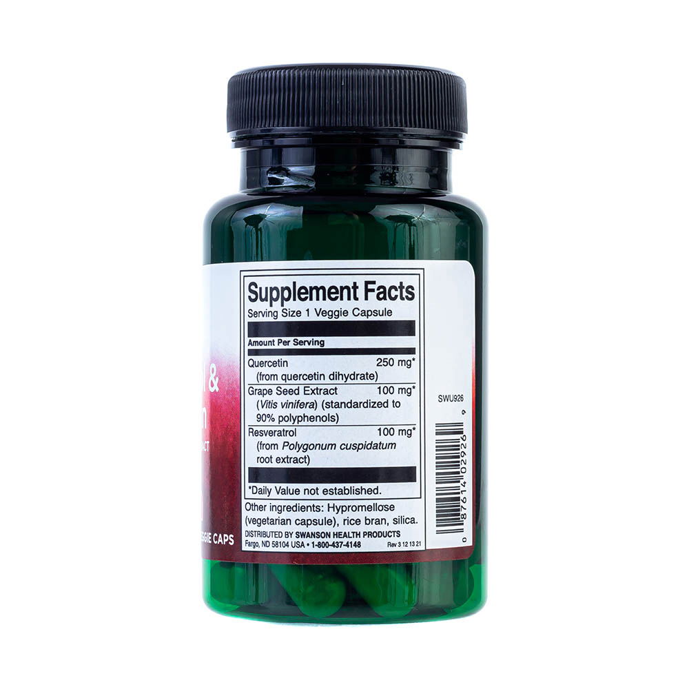 Această formulă premium de la Swanson valorifică forța antioxidanților naturali din plante: quercetina, un bioflavonoid cu acțiune antiinflamatoare; resveratrolul, renumit pentru rolul său în activarea genelor longevității; și extractul din sâmburi de struguri, sursă concentrată de proantocianidine, cu efecte dovedite asupra sănătății vasculare și protecției ADN-ului celular.