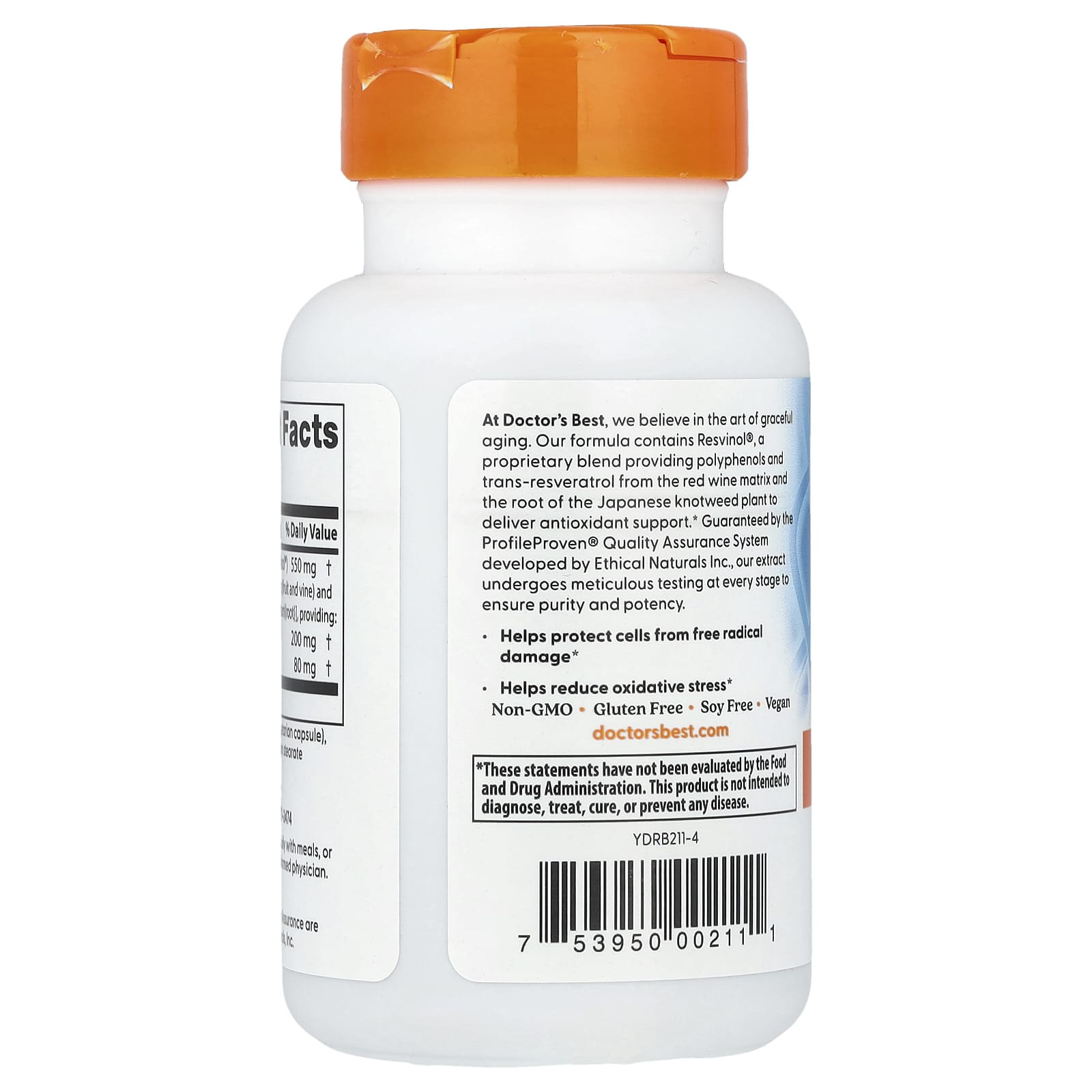 Trans-Resveratrol with Resvinol, 100 mg, Doctor's Best este un supliment alimentar premium formulat pentru a susține sănătatea celulară, funcția cardiovasculară, vitalitatea și procesele asociate longevității. Produsul conține un amestec brevetat de resveratrol (ResVinol®), obținut din matrice de vin roșu, struguri (Vitis vinifera – fructe și viță de vie) și rădăcină de troscot japonez (Polygonum cuspidatum). Acest complex furnizează 100 mg de trans-resveratrol – forma bioactivă cu cea mai ridicată relevanță biologică – și 80 mg de polifenoli, compuși naturali cu efect antioxidant puternic.