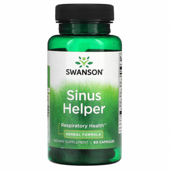 Sinus Helper (Sănătatea Căilor Respiratorii), Swanson este un supliment alimentar complex, formulat pentru a susține confortul respirator, sănătatea sinusurilor și funcționarea optimă a căilor respiratorii superioare în perioadezia de disconfort sezonier sau expunere la factori iritanți. Formula reunește un amestec echilibrat de plante tradițional utilizate pentru susținerea mucoaselor, fluidizarea secrețiilor, calmarea gâtului și sprijinirea mecanismelor naturale de apărare: Bayberry (Morella cerifera) – scoarță de rădăcină (65 mg), Echinacea purpurea – părți aeriene (65 mg), Goldenseal (Hydrastis canadensis) – rădăcină (65 mg), Licorice (Glycyrrhiza glabra) – rădăcină (65 mg), Myrrh (Commiphora myrrha) – rășină/gumă (65 mg), Plantain (Plantago spp) – frunze (65 mg) și Saw Palmetto (Serenoa repens) – fructe (65 mg).
