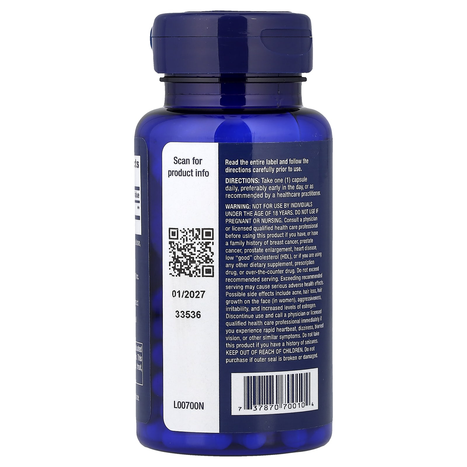 A nu se utiliza de către persoanele cu vârsta sub 18 ani. Nu utilizați dacă sunteți gravidă sau alăptați. Consultați un medic sau un profesionist calificat în domeniul sănătății înainte de a utiliza acest produs dacă aveți sau aveți antecedente familiale de cancer de sân, cancer de prostată, extindere a prostatei, boli de inimă, colesterol „bun” scăzut (HDL) sau dacă utilizați orice alt supliment alimentar, medicament eliberat pe bază de prescripție medicală sau medicamente eliberate fără prescripție medicală. Nu depășiți doza recomandată. Depășirea dozei recomandate poate provoca efecte adverse grave asupra sănătății. Reacțiile adverse posibile includ acnee, căderea părului, creșterea părului pe față (la femei), agresivitate, iritabilitate și niveluri crescute de estrogen. Întrerupeți utilizarea și sunați imediat un medic sau un profesionist calificat în domeniul sănătății dacă aveți bătăi rapide ale inimii, amețeli, vedere încețoșată sau alte simptome similare. A nu se lăsa la îndemâna copiilor.