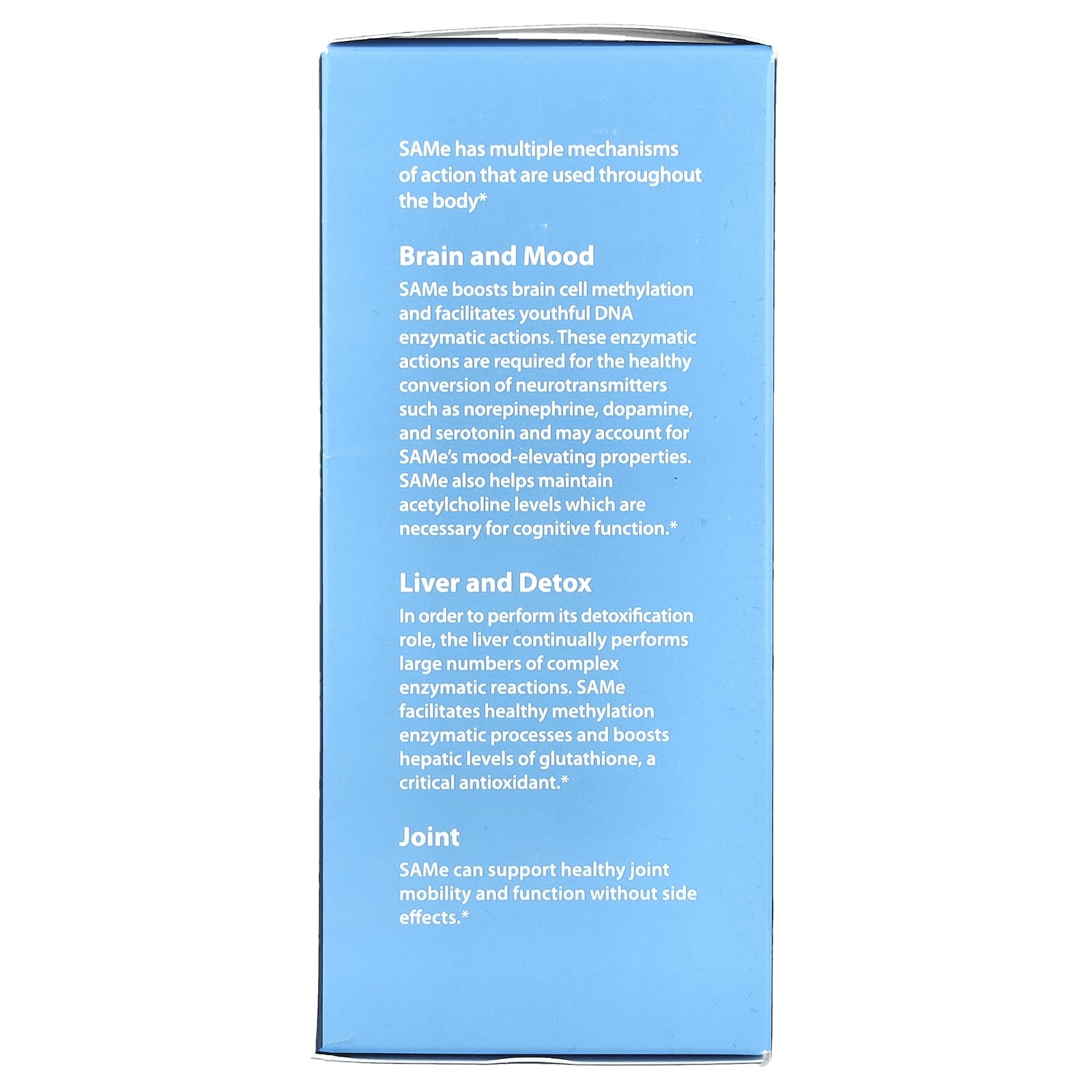 SAMe este cunoscut în special pentru rolul său în susținerea stării de spirit și a funcțiilor cognitive, dar și pentru importanța în sănătatea articulațiilor și a ficatului. Această versatilitate provine din faptul că SAMe este donator major de grupări metil, intervenind în sute de reacții enzimatice. Atunci când metilarea este eficientă, organismul poate susține mai bine sinteza substanțelor implicate în calm, motivație și claritate mentală, poate menține funcția hepatică optimă în fața toxinelor și poate sprijini procesele de regenerare tisulară care influențează confortul articular.
