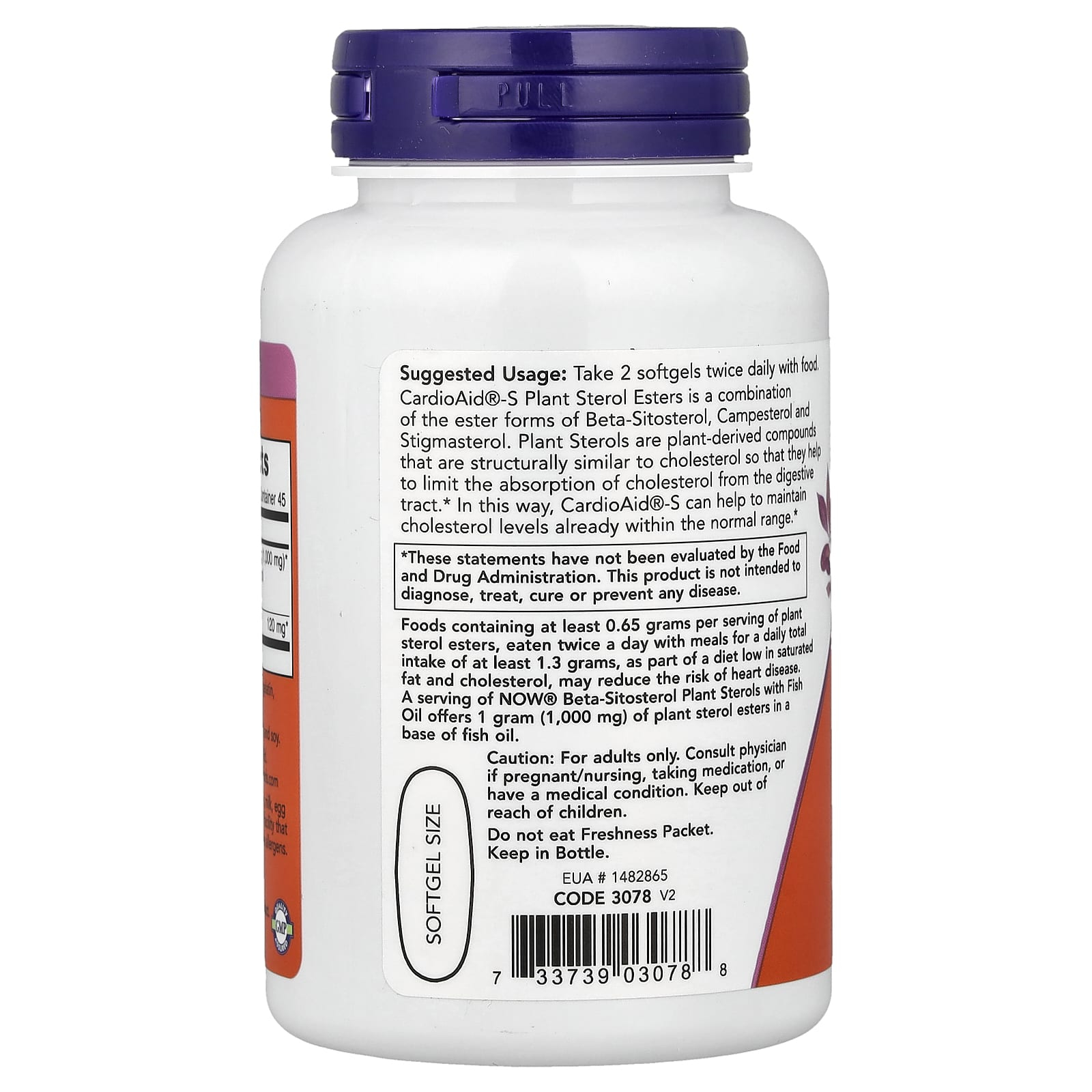 Alimente care conțin cel puțin 0,65 grame per porție de esteri de sterol vegetal, consumate de două ori pe zi în timpul meselor pentru un aport zilnic total de cel puțin 1,3 grame, ca parte a unei diete sărace în grăsimi saturate și colesterol, poate reduce riscul de boli de inimă. O porție de NOW® Beta-Sitosterol Plant Sterols cu Ulei de Pește oferă 1 gram (1.000 mg) de esteri de sterol vegetal într-o bază de ulei de pește.