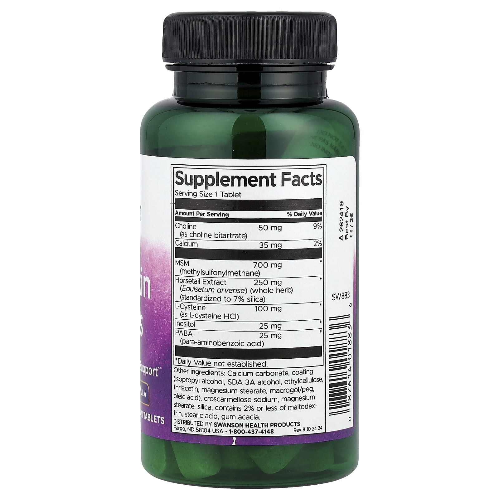Hair, Skin & Nails, Swanson, cu MSM 700 mg, coada-calului (7% silice) 250 mg, L-cisteină 100 mg, colină 50 mg, inozitol 25 mg, PABA 25 mg și calciu 35 mg, oferă o abordare completă a frumuseții din interior: cheratină fortificată pentru păr și unghii, matrice dermică susținută pentru piele suplă și un profil metabolic armonizat pentru un look sănătos, coerent și durabil.