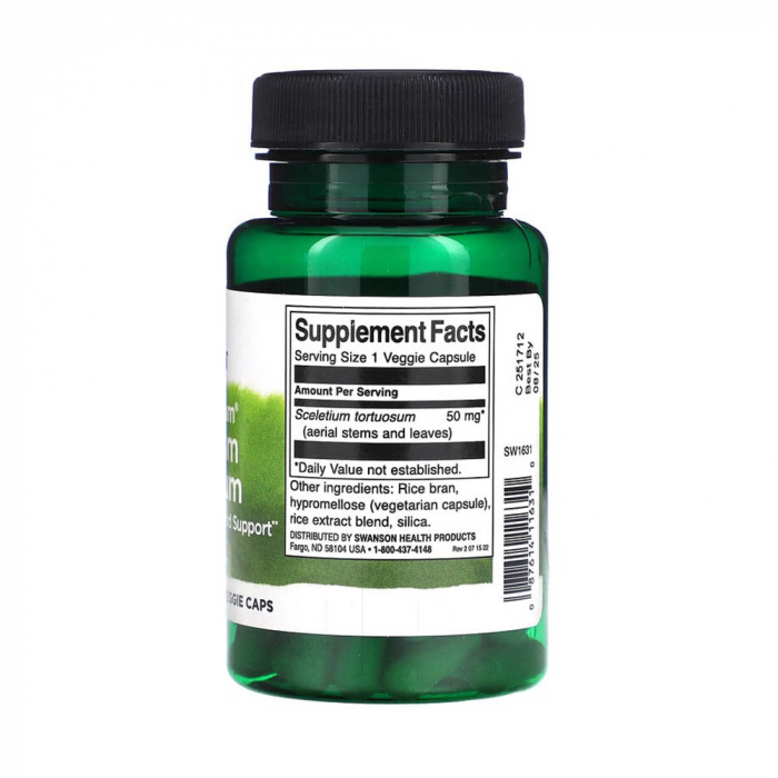 Full Spectrum Sceletium Tortuosum, 50 mg, Swanson este un supliment alimentar ce conține părțile aeriene și frunzele de Sceletium Tortuosum, o plantă indigenă Africii de Sud, recunoscută pentru proprietățile sale extraordinare în îmbunătățirea stării de bine mentale și suportul emoțional. Cunoscută și sub numele de "Kanna", "Channa" sau "Kougoed", Sceletium Tortuosum a fost utilizată tradițional de către popoarele indigene pentru a relaxa corpul, a calma mintea și a promova o stare de bine.