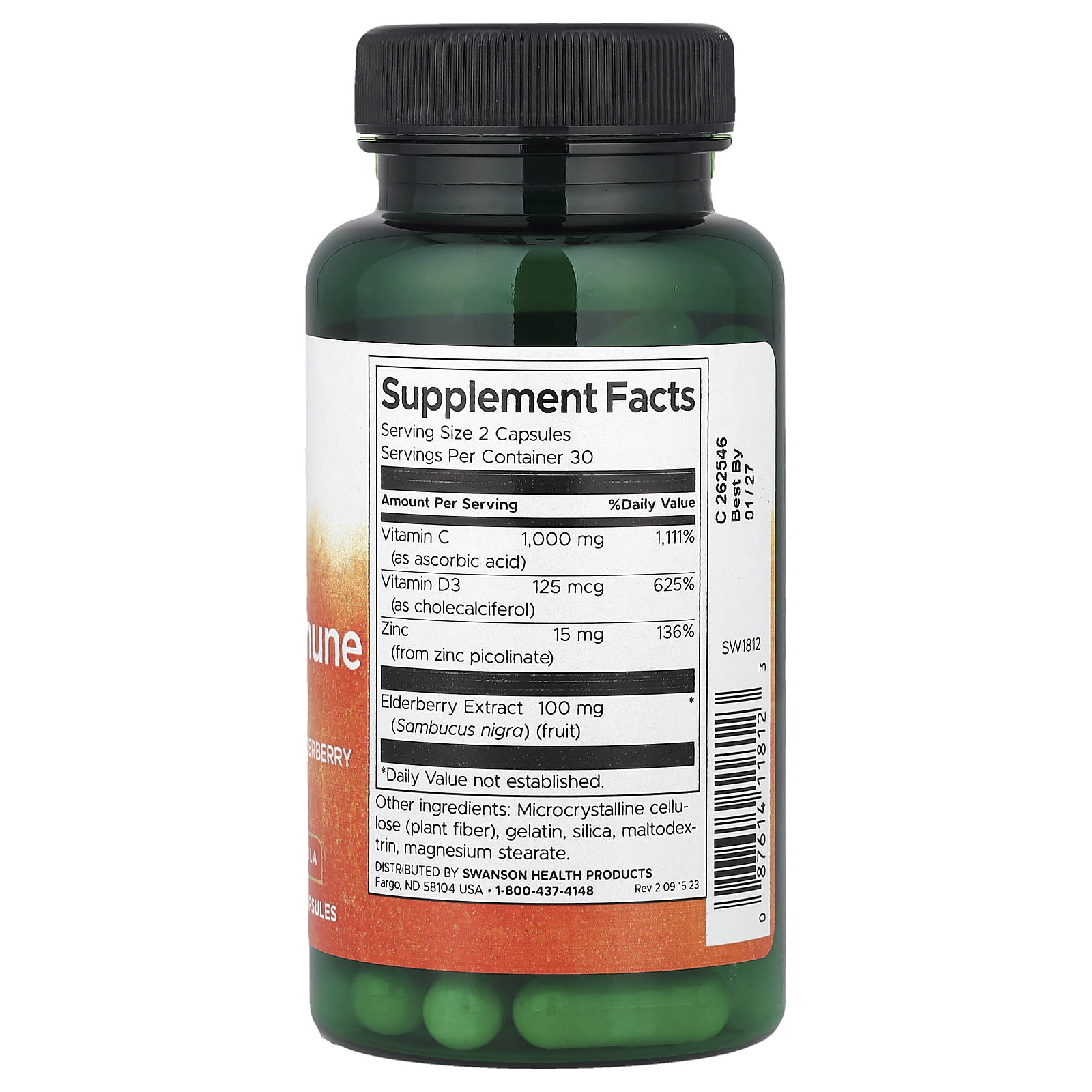 Ultimate Immune Defense with C, D, Zinc & Elderberry, Swanson este un supliment complex creat pentru a susține organismul în perioadele de solicitare imunitară crescută. Fiecare porție oferă o combinație concentrată de nutrienți esențiali pentru apărarea naturală a corpului: vitamina C (1.000 mg, sub formă de acid ascorbic), vitamina D3 (125 mcg / 5.000 UI, ca colecalciferol), zinc (15 mg, din zinc picolinat – o formă bine utilizată de organism) și extract de soc negru (Sambucus nigra, 100 mg, din fructe). Această formulă este concepută pentru a susține funcționarea optimă a sistemului imunitar, pentru a oferi protecție antioxidantă puternică și pentru a menține confortul căilor respiratorii în fața factorilor de mediu.